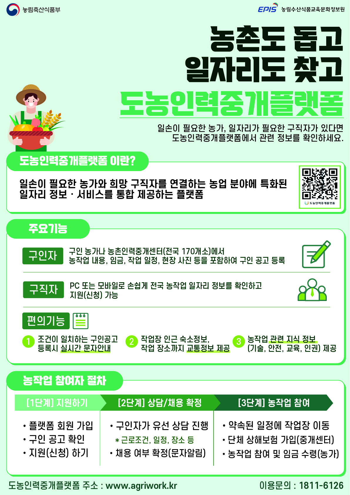 농림축산식품부에서는 농작업 참여를 희망하는 구직자와 구인 농가를 연결하는 농촌인력중개센터 사업과 연계, 도농인력중개플랫폼을 구축하여 운영중에 있습니다.