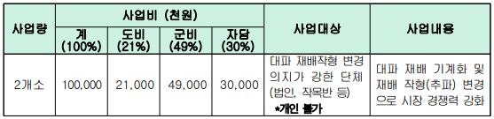 라. 사업내역 : 2개소 / 개소당 50,000천원(도비 10,500, 군비 24,500, 자담 15,000)