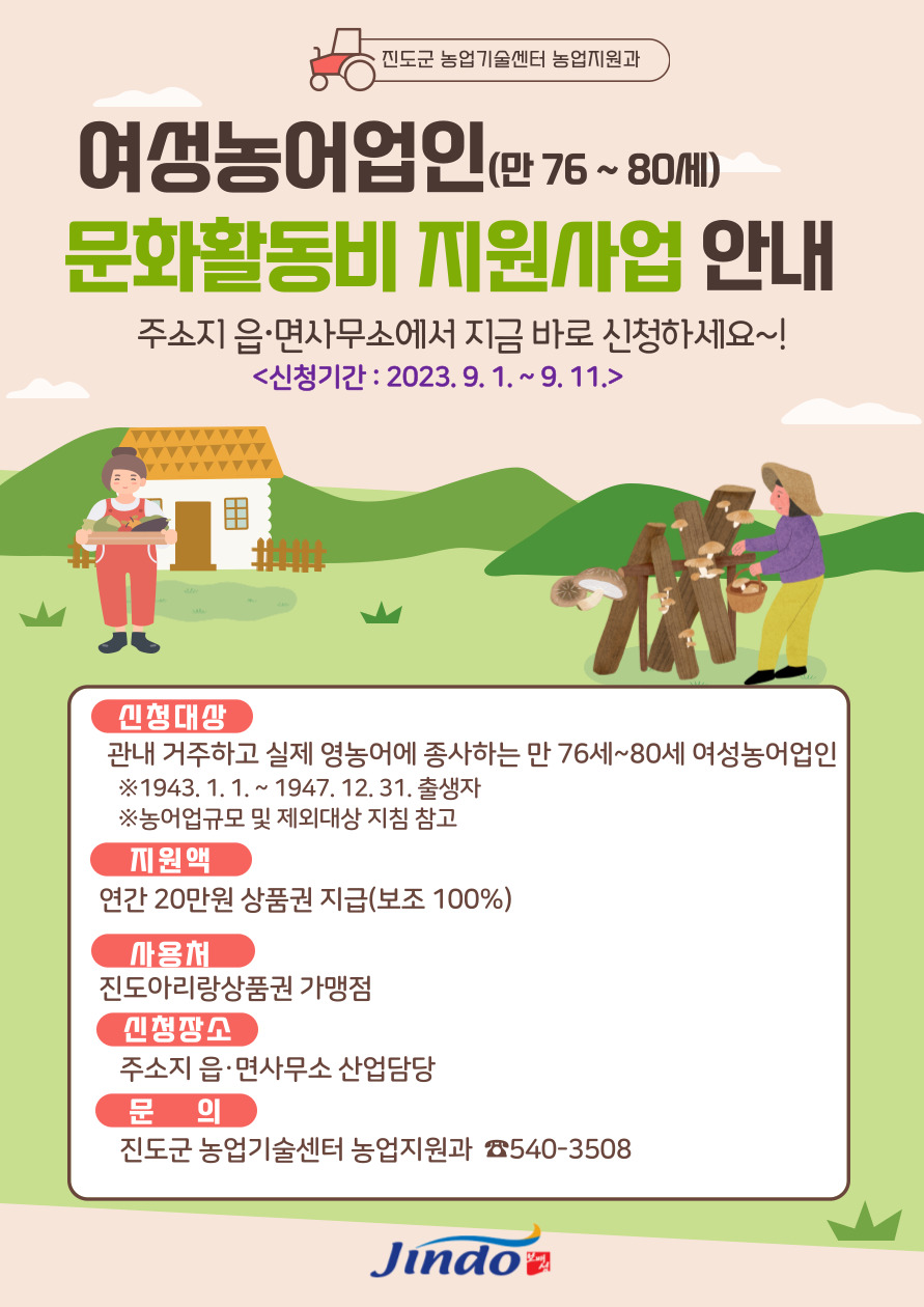 2023년 여성농어업인 문화활동비(만 76~80세) 지원사업 신청 안내(2차)