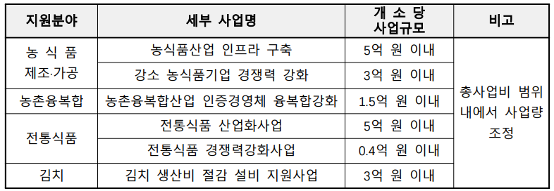 2024년 농식품 가공분야 지원사업(농식품 제조·가공, 농촌융복합, 전통식품, 김치) 대상자 선정을 위한 공모 안내드립니다.
