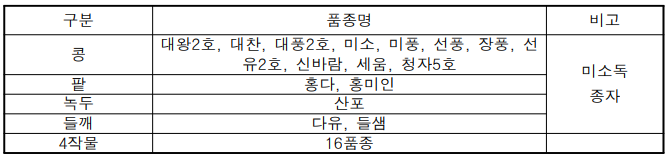 - 2월 : 참깨(강유, 조백, 하니올), 땅콩(신팔광, 고원1호), 조(삼다찰), 수수(소담찰,고은찰), 기장(금실찰, 연희찰), 사료용옥수수(광평옥), 식용옥수수(일미찰)