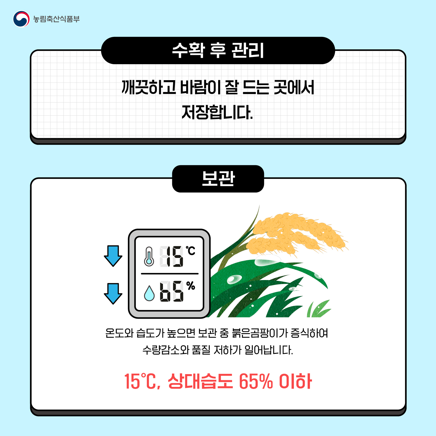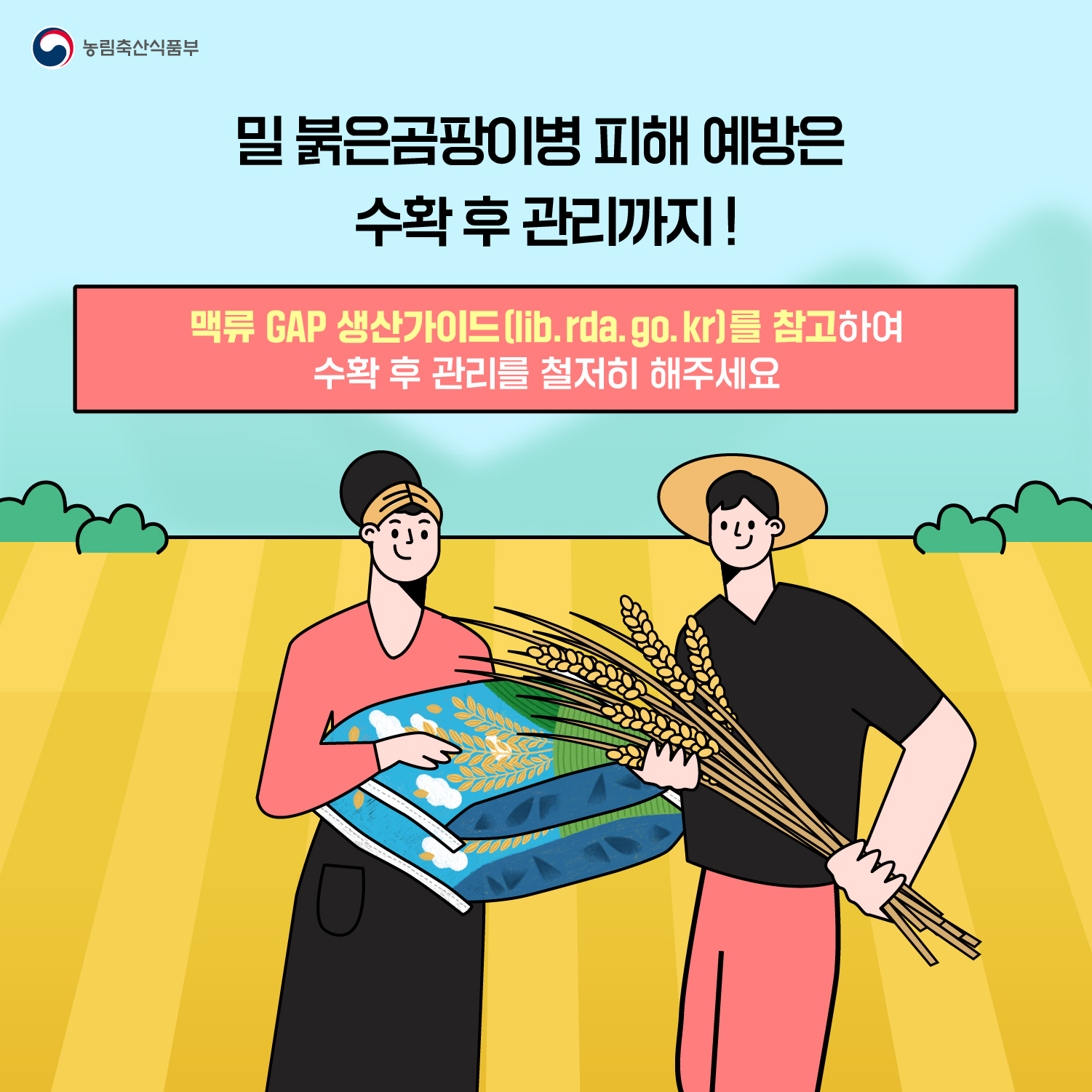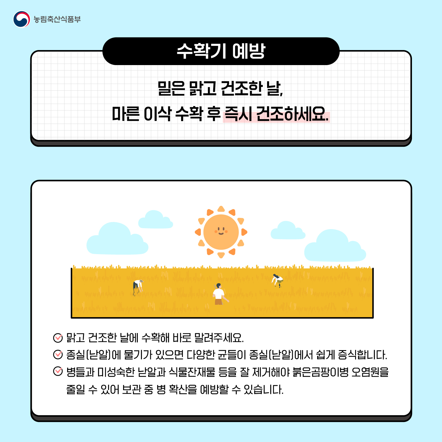 밀 붉은곰팡이병(곰팡이독소) 예방을 위해 적기(출수기) 농약방제, 적기 수확(완숙기 맑은 날), 수확 후 즉시 건조(12% 이하) 등을 지켜주시기 바랍니다.