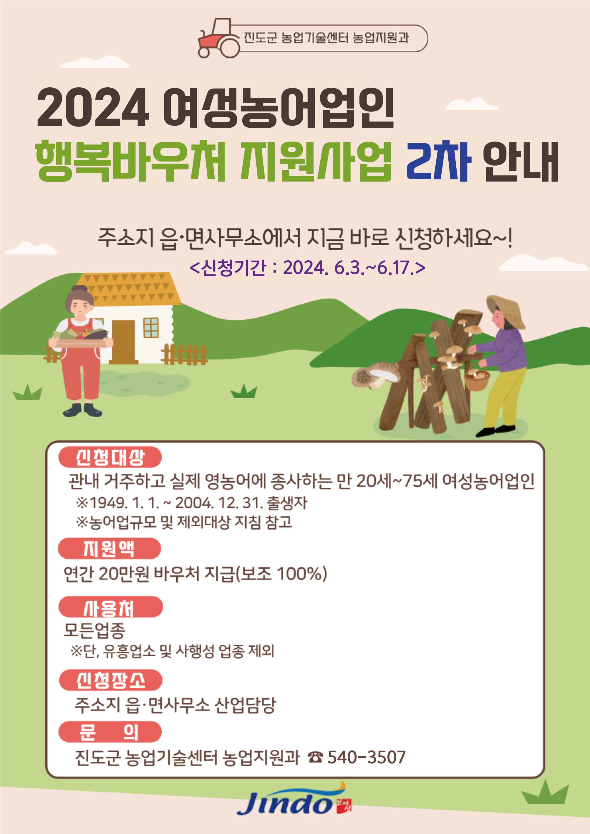 2024년 여성농어업인 행복바우처 지원사업(2차)에 대하여 다음과 같이 안내드립니다.