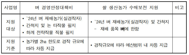 「2024년 벼 경영안정대책비 지원사업」 및 「2024년 쌀 생산농가 수매보전 지원금」 시행지침을 다음과 같이 안내드립니다.