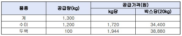 나. 공급품종 : 2품종(수미 1,200kg, 두백 100kg)