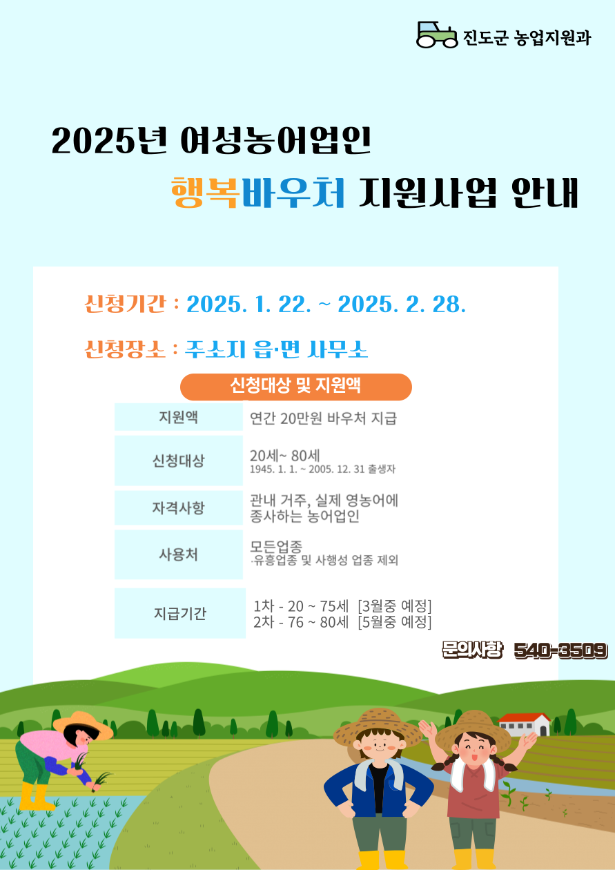 공지사항 2025년 여성농어업인 행복바우처 지원사업 신청 안내 농업기술센터 2025-01-22 10:56 조회 549 첨부파일 2025년전라남도여성농어업인행복바우처지원사업시행지침.hwp 다운로드 이전글 2025년 청년농업인 스타트업(초기창업) 지원사업 대상자 모집 공고 다음글 2025년 진도땅콩 생산비 절감 재배 시범사업 신청안내(재공고) 목록 제공되는 서비스에 대하여 만족하십니까? 만족도 60% 고객만족도 평가 매우만족 만족 보통 불만족 매우불만족 QR Code 이미지를 스마트폰에 인식시키면 자동으로 이 페이지로 연결됩니다. 이 QR Code는 『공지사항』의 정보를 담고 있습니다.