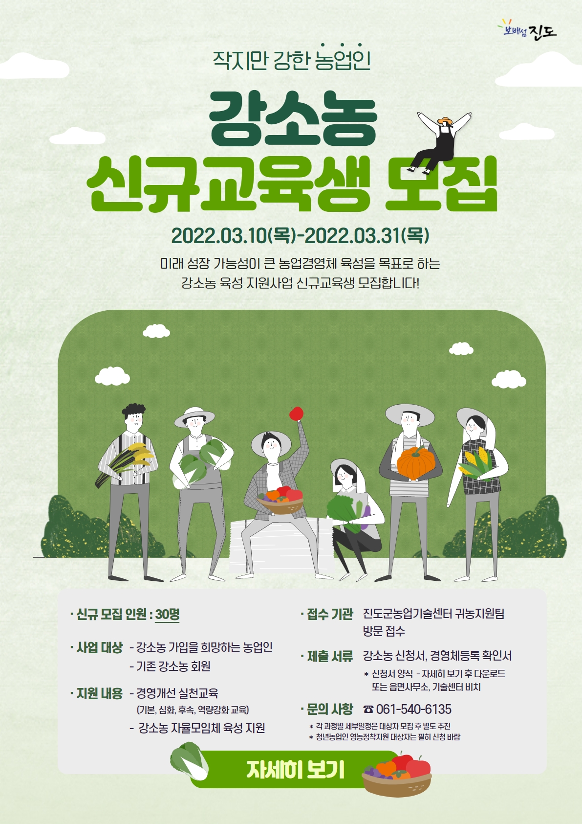 농가경영개선 실천교육을 통해 농업인 자립역량 강화와 작지만 강한 강소농, 미래 성장 가능성이 큰 농업경영체 육성을 목표로 하는 강소농 육성 지원사업 신규교육생 모집을 다음과 같이 공모합니다.