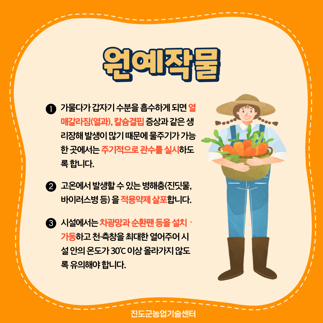 기온이 올라가면 작물은 작물은 생육부진으로 인한 수량감소, 양분 결핍, 품질 저하되는 등 피해가 나타나므로 고온에 대한 대처를 잘해야 합니다.