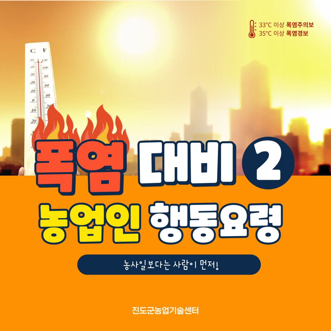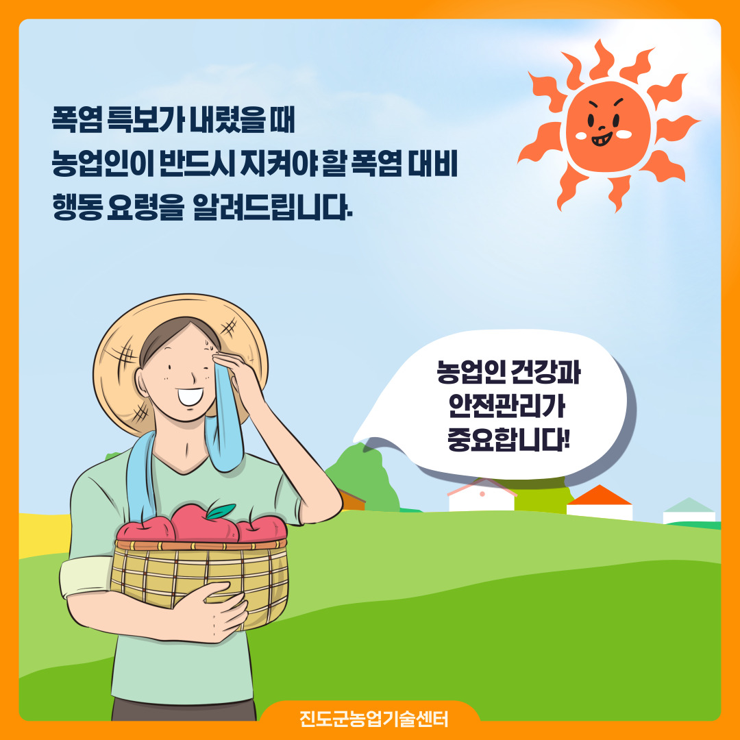 폭염 특보가 내렸을 때 농업인이 반드시 지켜야 할 폭염대비 행동요령을 알려드립니다.