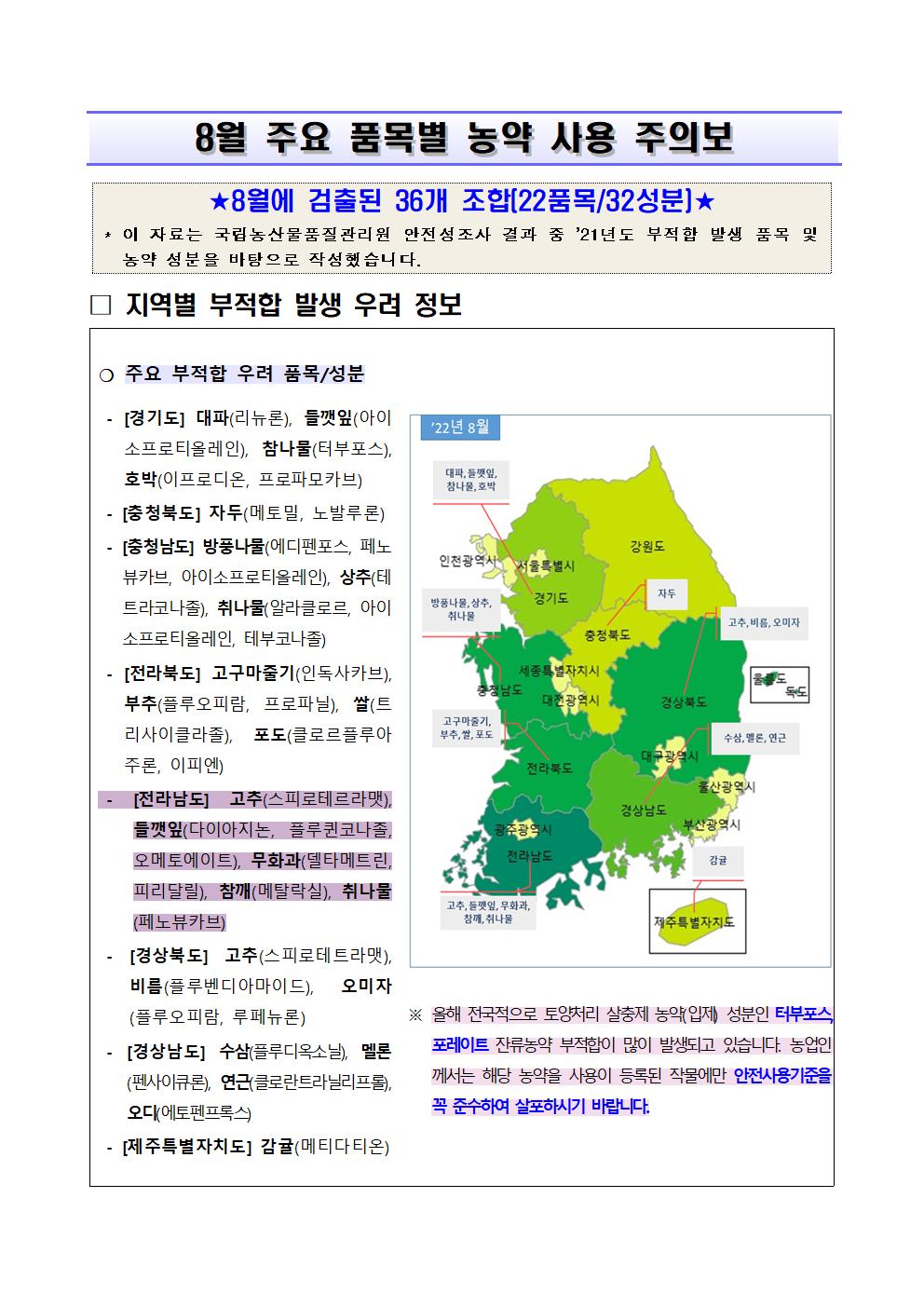 8월 주요 품목별 농약 사용 주의보를 안내드립니다.