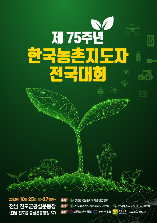 전국 17개 시도, 194개 시·군 농촌지도자회원 및 진도군민 등 1만5천여 명이 참가하는 ‘제 75주년 한국농촌지도자 전국대회’가 오는 10월 25일부터 3일간 전남 진도군 공설운동장에서 열린다.