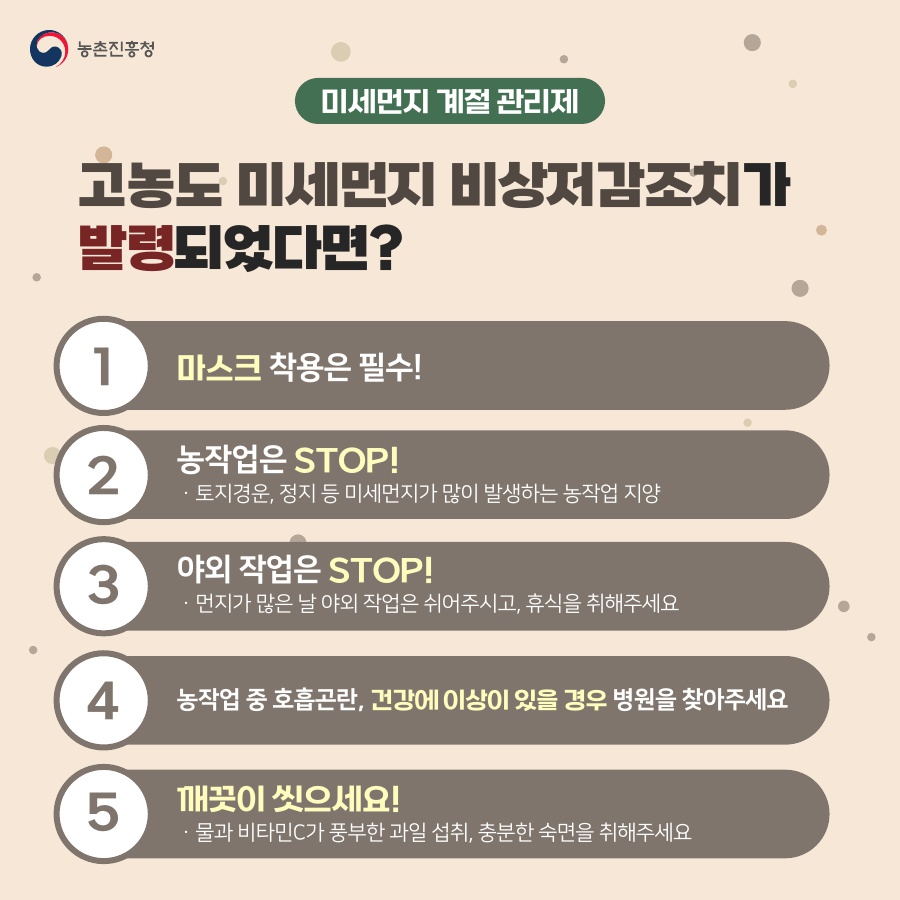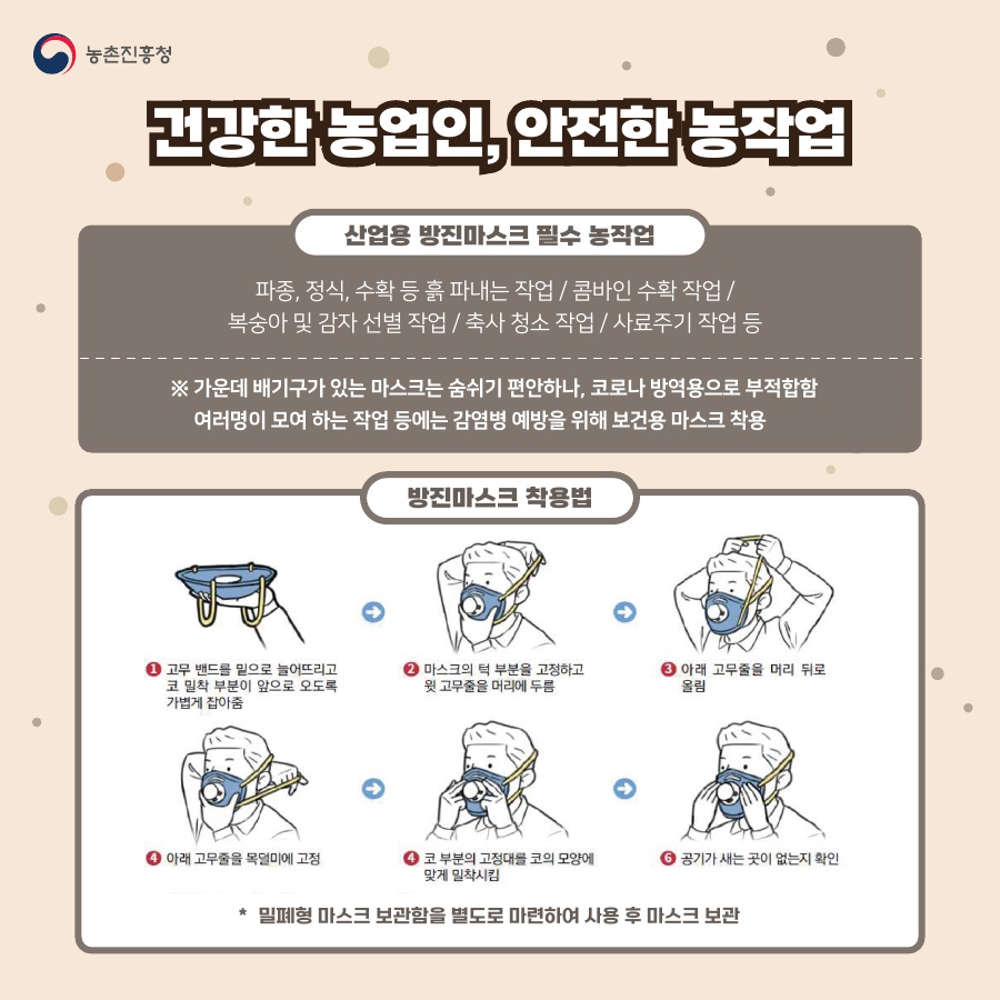 농업인은 경운·정지, 정식작업 등으로 높은 농도의 미세먼지에 노출되는 경우가 있습니다. 장시간 야외 작업으로 일반일보다 미세먼지에 노출되는 시간이 깁니다.