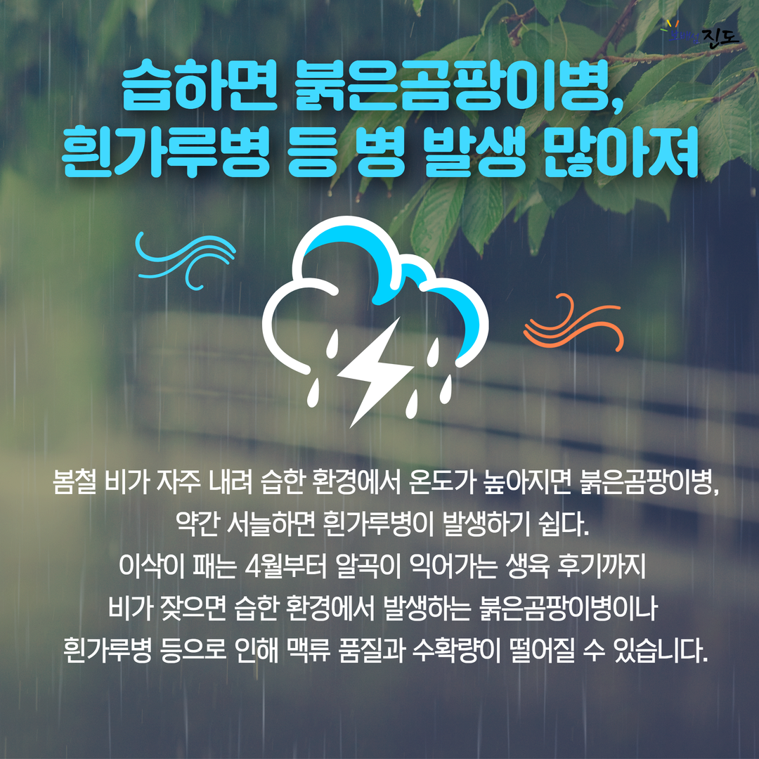 이삭이 패는 4월부터 알곡이 익어가는 생육 후기까지 비가 잦으면 습한 환경에서 발생하는 붉은곰팡이병이나 흰가루병 등으로 인해 맥류 품질과 수확량이 떨어질 수 있습니다.