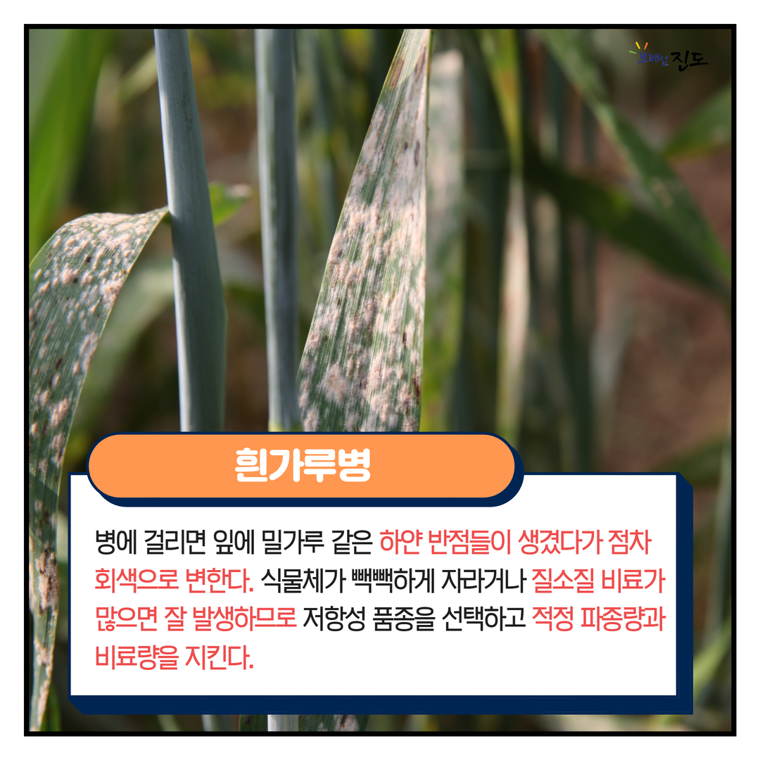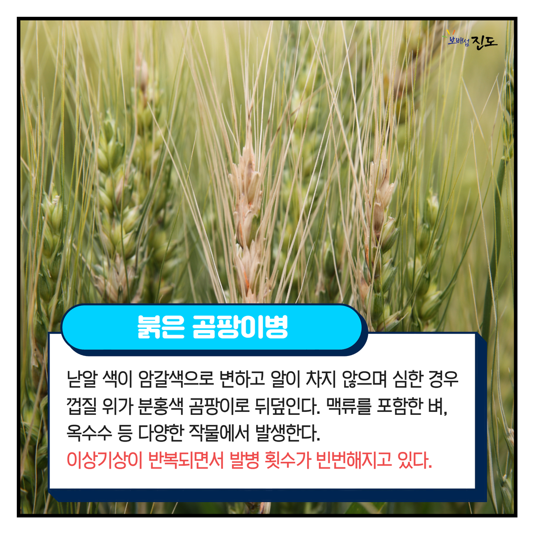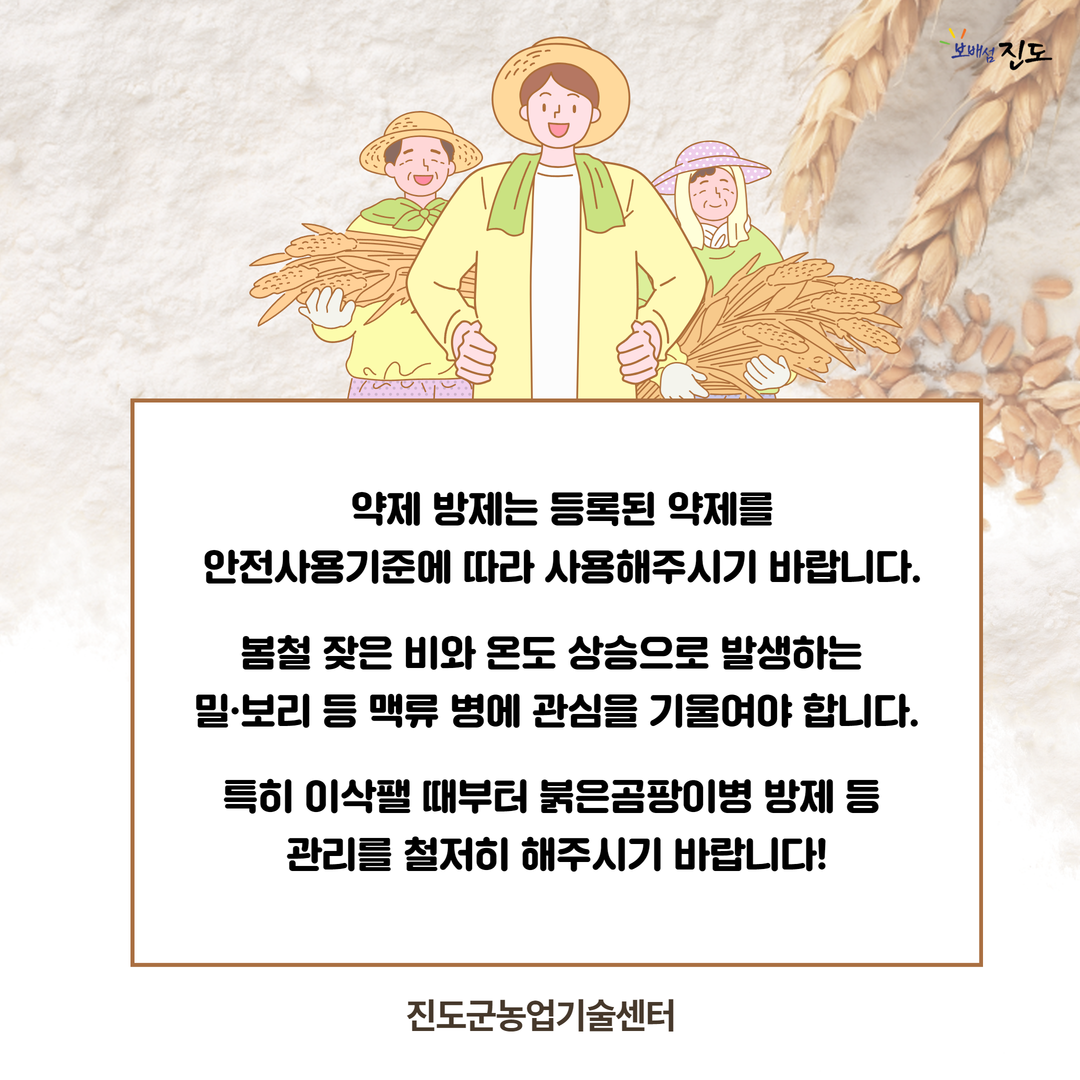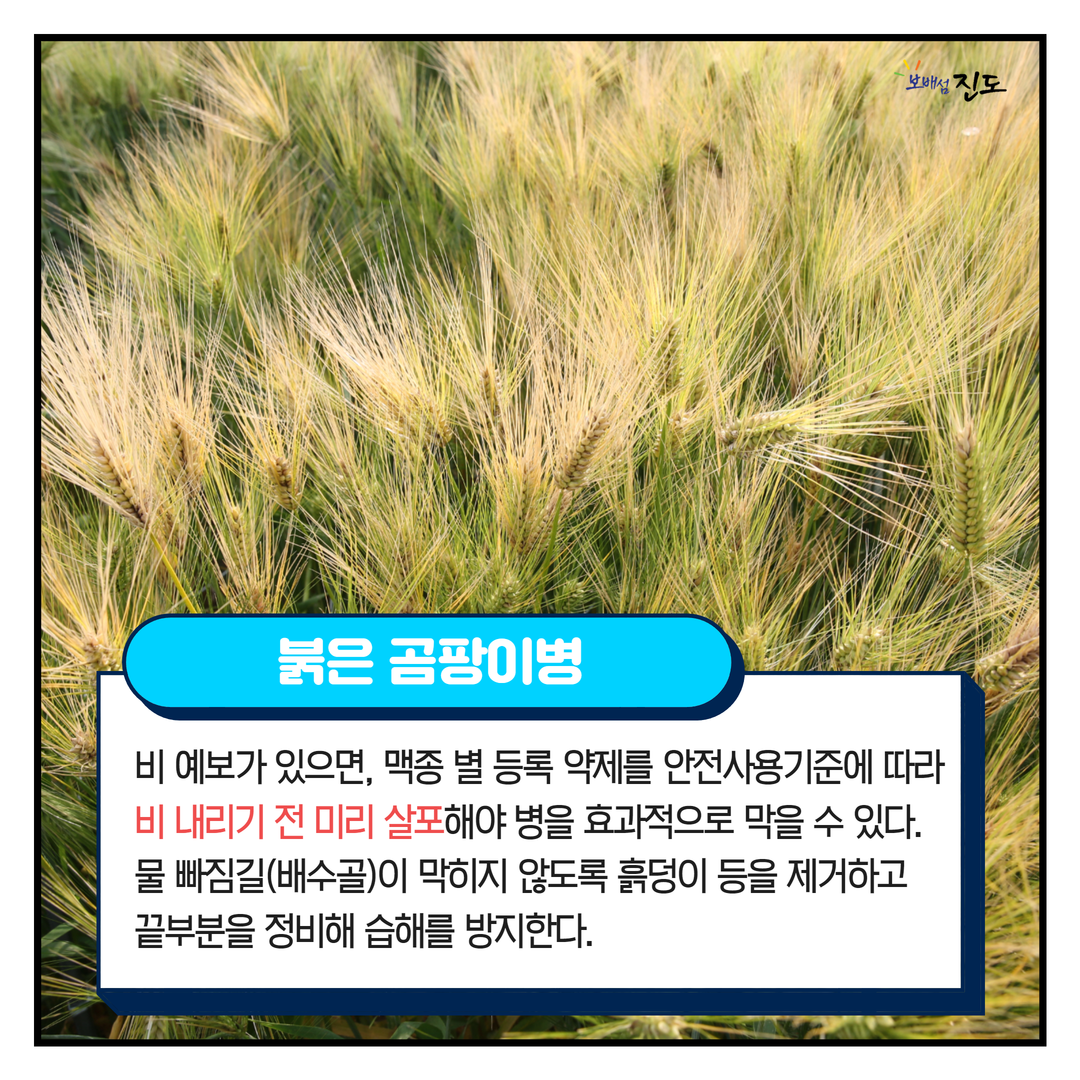 밀·보리 등 맥류 병에 관심을 기울여 주시기 바라며, 특히 이삭팰 때부터 붉은곰팡이병 방제 등 관리를 철저히 해주시기 바랍니다.