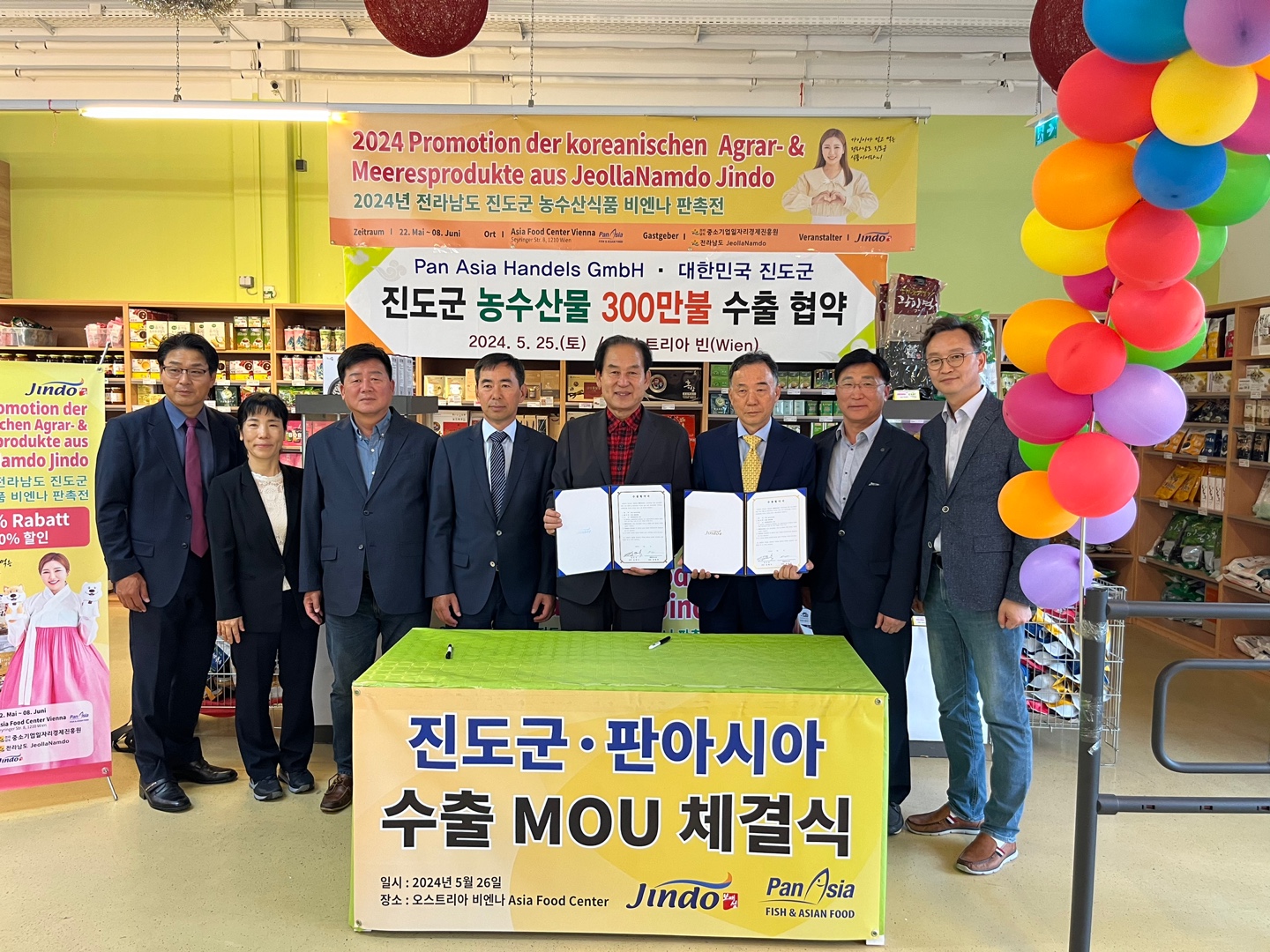 전남 진도군은 김희수 군수를 단장으로 한 농수산물 수출개척단이 오스트리아 빈(Wien)을 방문, 현지 식품수입유통업체인 '㈜판아시아(Pan Asia Handels GmbH)'와 300만달러 수출협약을 체결했다고 28일 밝혔다.