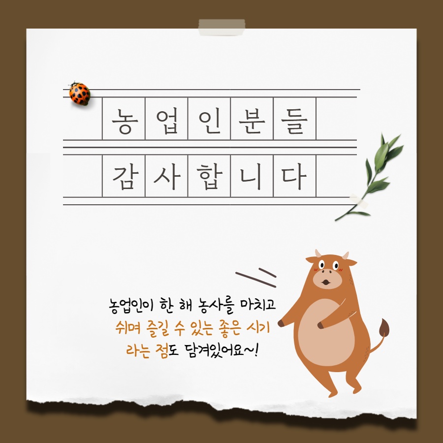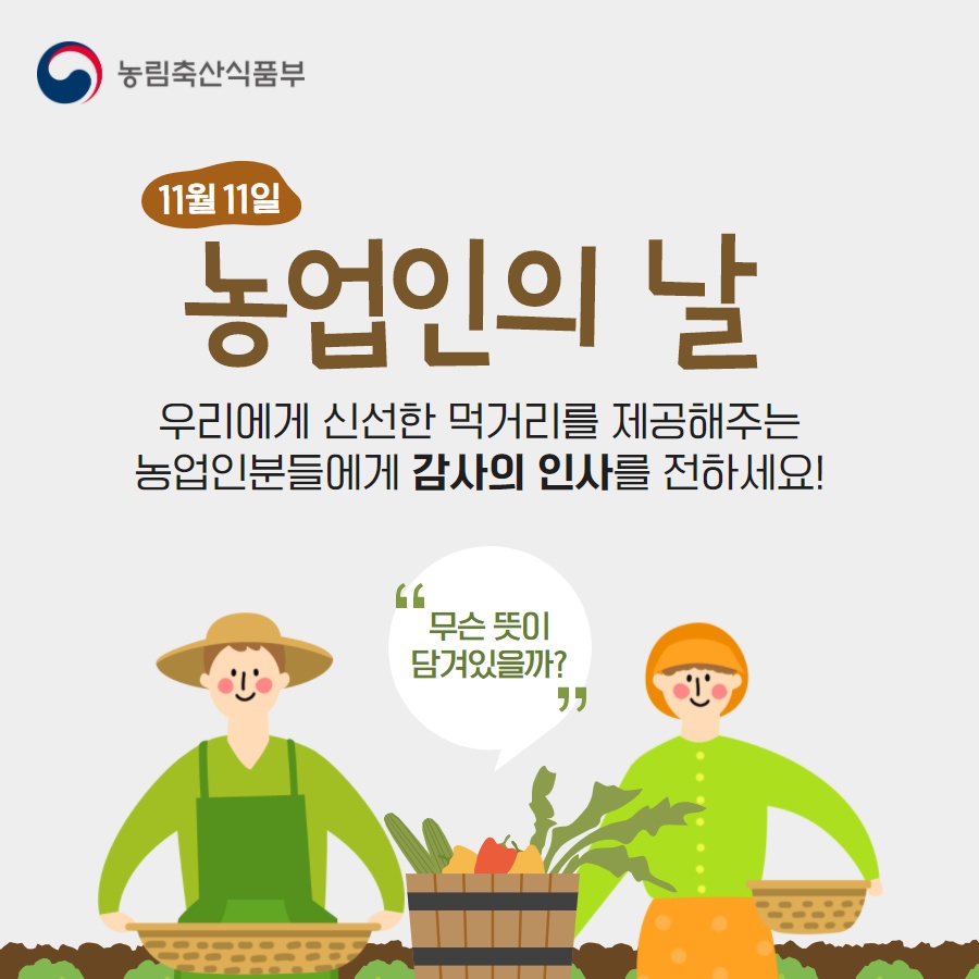 보도자료 11월 11일은 농업인의 날 황지숙 2020-11-11 10:51 조회 627 -1- -2- -3- 출처 : 농림축산식품부 블로그 이전글 논밭두렁 태우지 않기 다음글 환절기 '뿌리 채소'로 건강 챙기세요!! 목록 제공되는 서비스에 대하여 만족하십니까? 만족도 60% 고객만족도 평가 매우만족 만족 보통 불만족 매우불만족 QR Code 이미지를 스마트폰에 인식시키면 자동으로 이 페이지로 연결됩니다. 이 QR Code는 『보도자료』의 정보를 담고 있습니다.