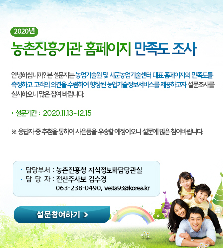 보도자료 농촌진흥기관 홈페이지 만족도 조사 설문 황지숙 2020-11-17 11:26 조회 548 농촌 지도 기관 홈페이지 만족도를 위한 설문 조사입니다. 농업기술원 및 시군농업기술센터 대표 홈페이지의 만족도를 측정하고 의견을 수렴하여 향상된 농업기술정보서비스를 제공하고자 하오니 하단 사이트에 접속하셔서 설문조사에 협조하여 주시면 감사하겠습니다. ▶ http://www.rda.go.kr/research/2020/question_2020_0106.jsp 이전글 토양검정 안내(토양채취방법 및 토양검정 과정) 다음글 주요 작물 재배기술 - 배추 목록 제공되는 서비스에 대하여 만족하십니까? 만족도 60% 고객만족도 평가 매우만족 만족 보통 불만족 매우불만족 QR Code 이미지를 스마트폰에 인식시키면 자동으로 이 페이지로 연결됩니다. 이 QR Code는 『보도자료』의 정보를 담고 있습니다.