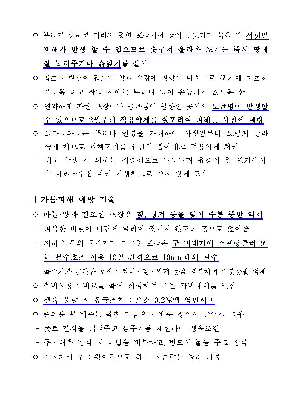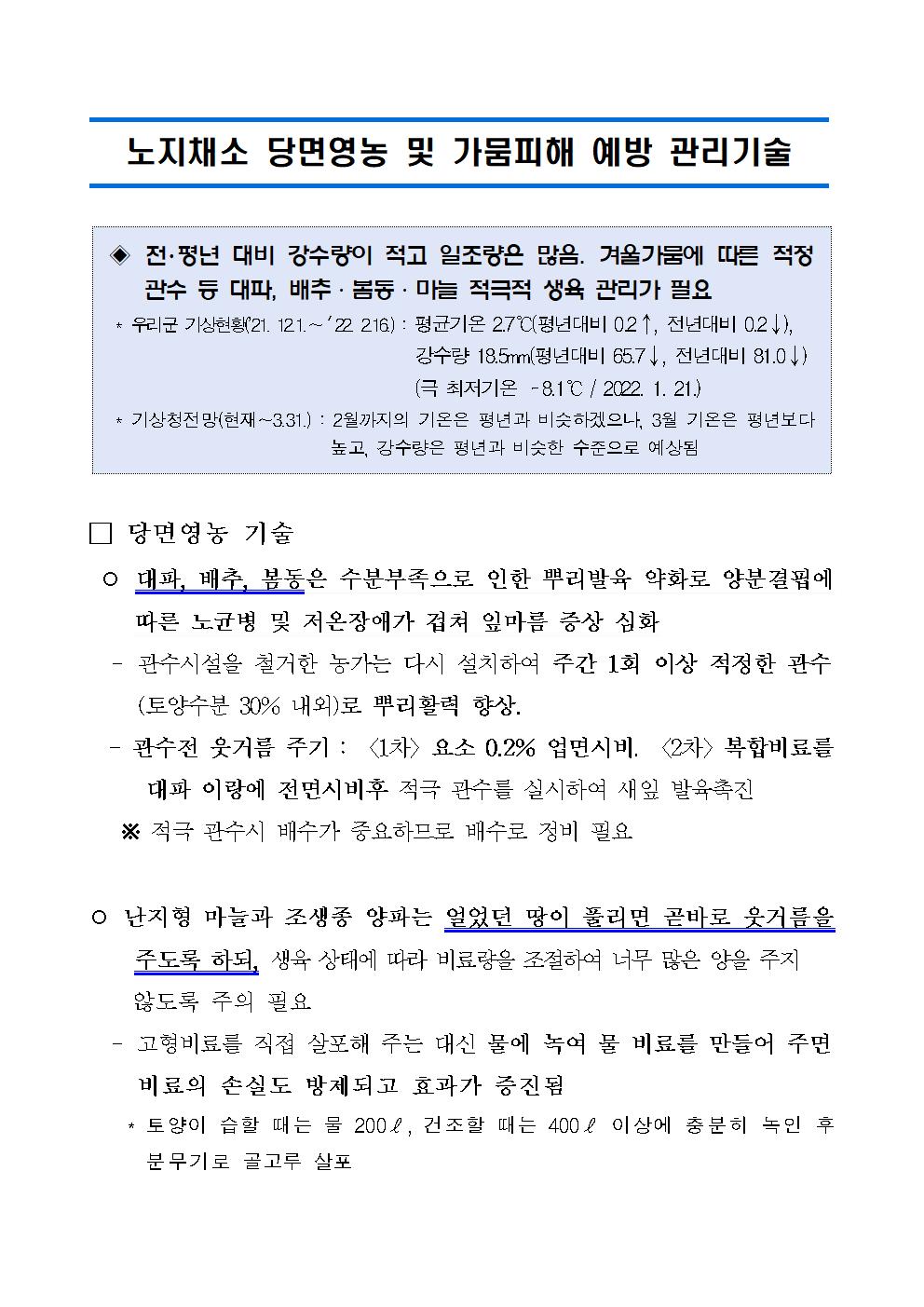 우리군 최근 기상관측 결과 전・평년 대비 강수량 감소로 인한 겨울가뭄이 발생되고 있어 대파, 배추, 봄동, 마늘 등 노지채소 적정 관수 및 적극적인 생육 관리가 필요합니다.