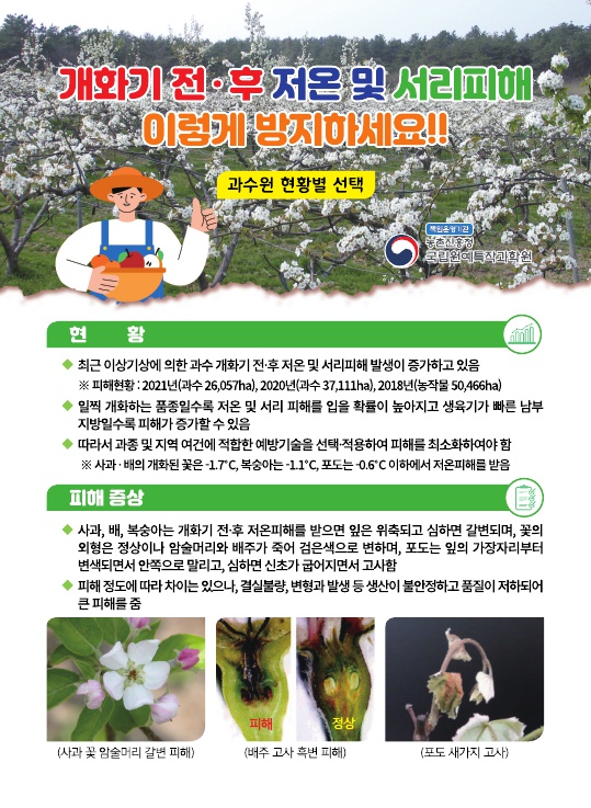 농업인분들께서는 피해 예방요령을 미리 숙지하시어 서리, 저온 등 기상정보에 따라 적극 대응해주시기 바랍니다.