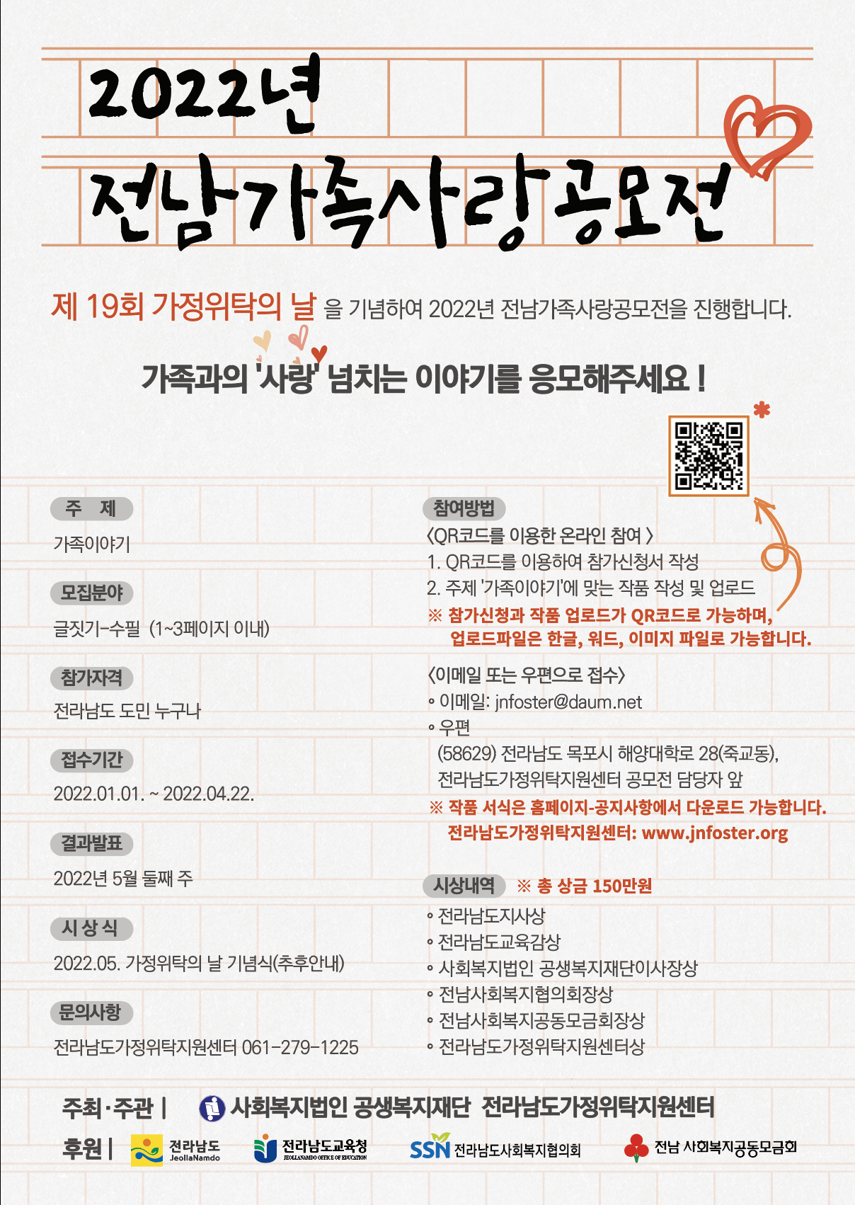 제 19회 가정위탁의 날을 기념하여 2022년 전남가족사랑공모전을 진행합니다.