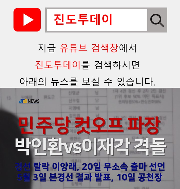 [JTB NEWS/진도투데이] [속보] 민주당 컷오프 파장 박인환vs이재각 격돌 경선 탈락 이양래, 20일 무소속 출마 선언 5월 3일 본경선 결과 발표, 10일 공천장