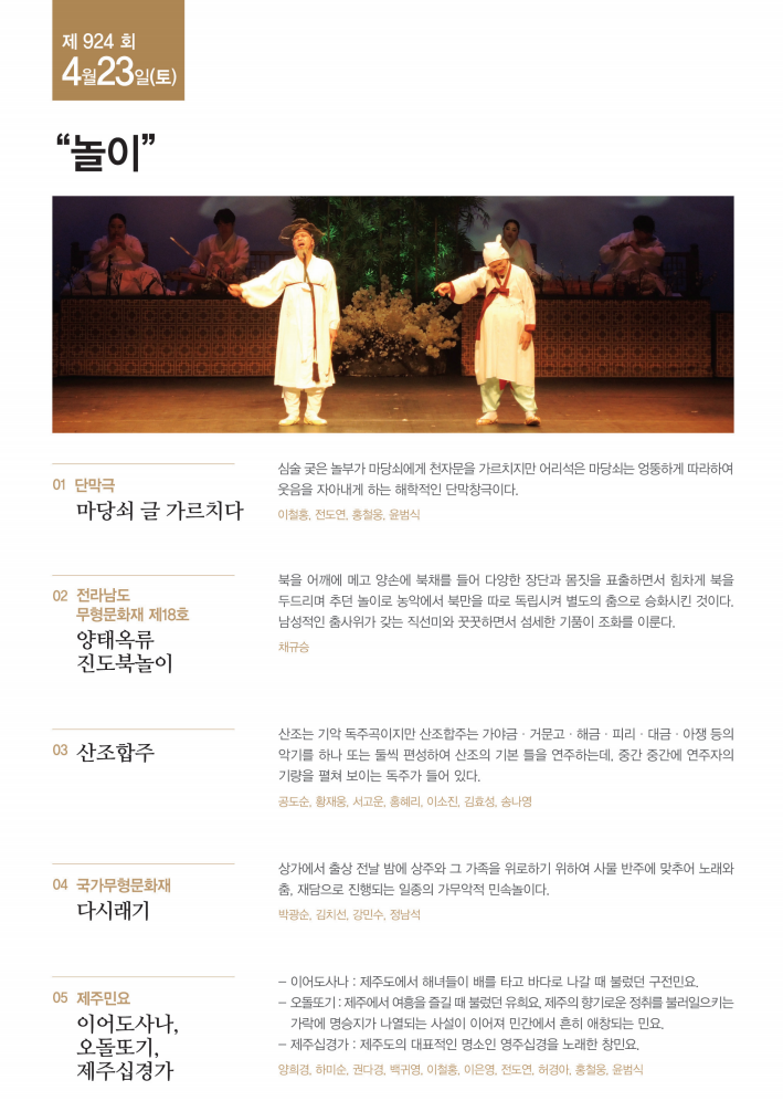 제924회 진도토요민속여행 상설공연이 "놀이"를 주제로 펼쳐집니다.