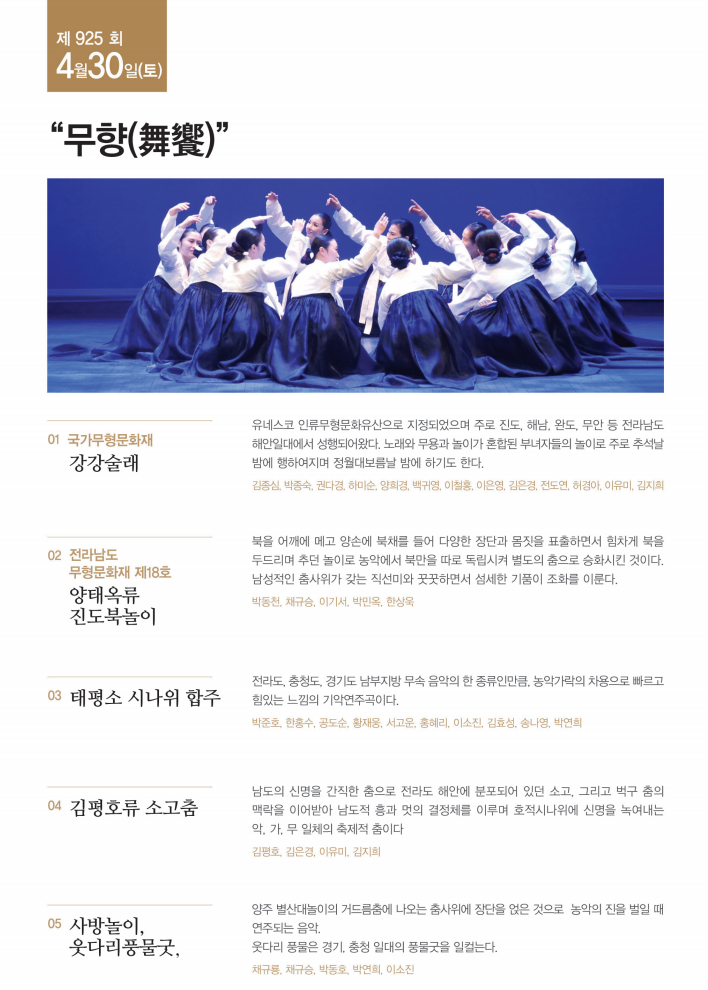 제925회 진도토요민속여행 상설공연이 "무향"을 주제로 펼쳐집니다.