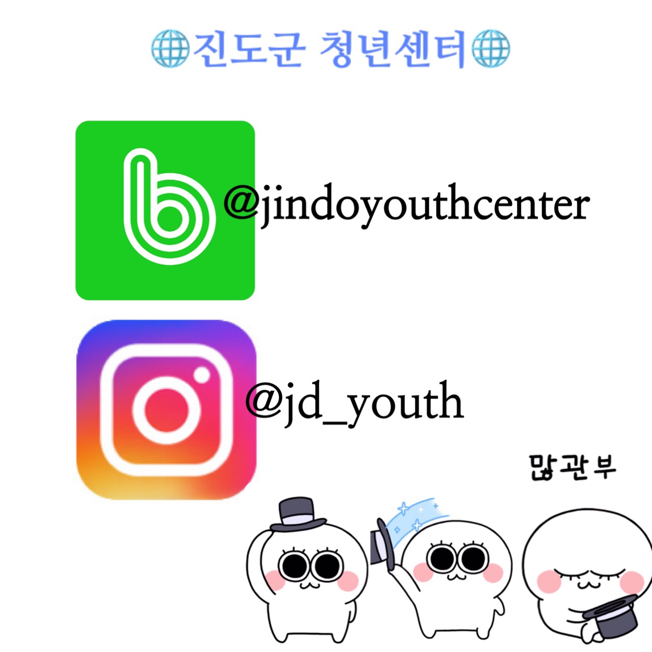 진도군 청년센터 네이버밴드와 인스타 그램을 개설하였습니다. 진도군 청년들을 위한 청년센터 활동소식과 청년 정책들을 자주 업로드 하오니 많은 관심과 이용 부탁드립니다!