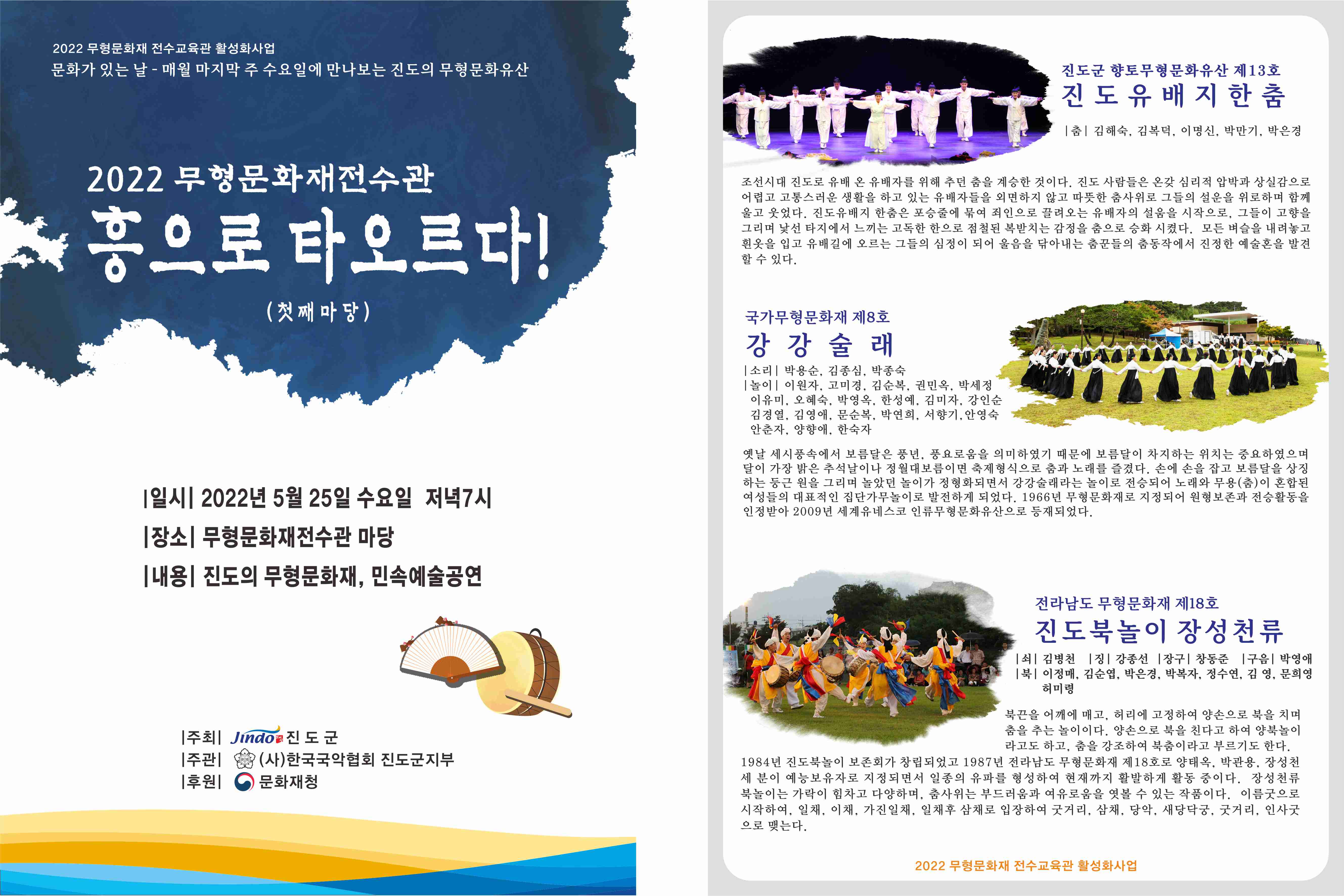 공연 안내 [ 2022 무형문화재 전수관 흥으로 타오르다! ] 일시 : 매달 마지막 주 수요일(5월~10월) 장소 : 진도군무형문화재전수관 야외마당 내용 : 진도의 무형문화재 및 향토문화예술 공연 문화가 있는날(매달 마지막 주 수요일)에 만나보는 진도의 무형문화유산 공연 많은 관심 부탁드립니다.