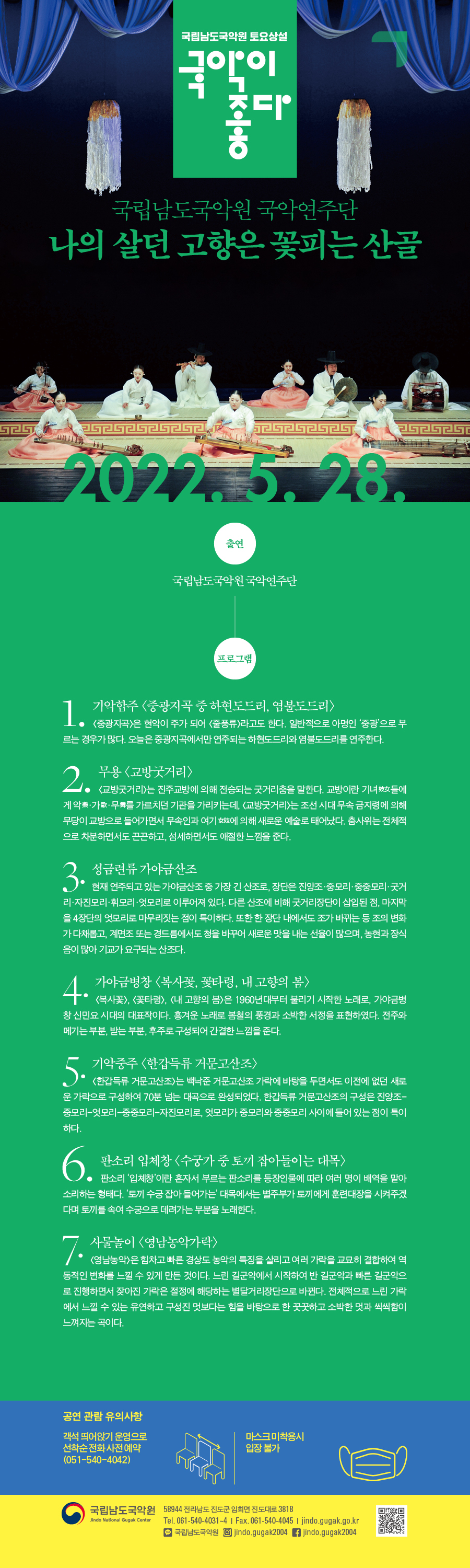 5월 마지막 주 토요상설 ‘국악이 좋다!’는 국립남도국악원 국악연주단 공연입니다.