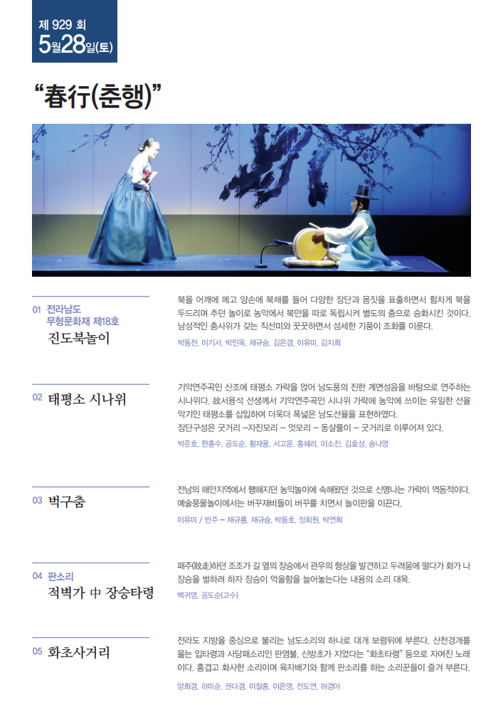 제929회 진도토요민속여행 상설공연이 "춘행(春行)"를 주제로 펼쳐집니다.