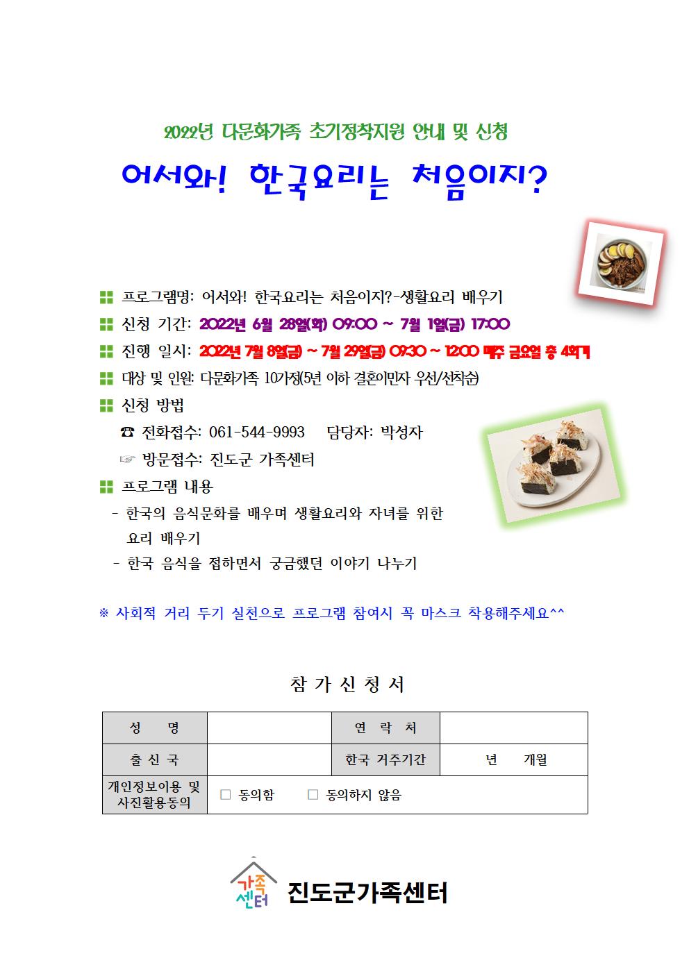 ♣가족센터♣ 다문화가족 초기정착프로그램 '어서와! 한국요리는 처음이지?' 신청 안내