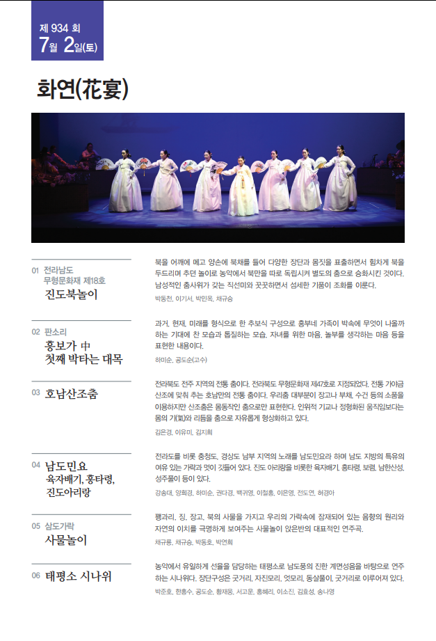 진도북놀이, 흥보가, 호남산조춤, 남도민요, 사물놀이, 태평소 시나위 등 다양한 공연이 준비되어 있습니다.