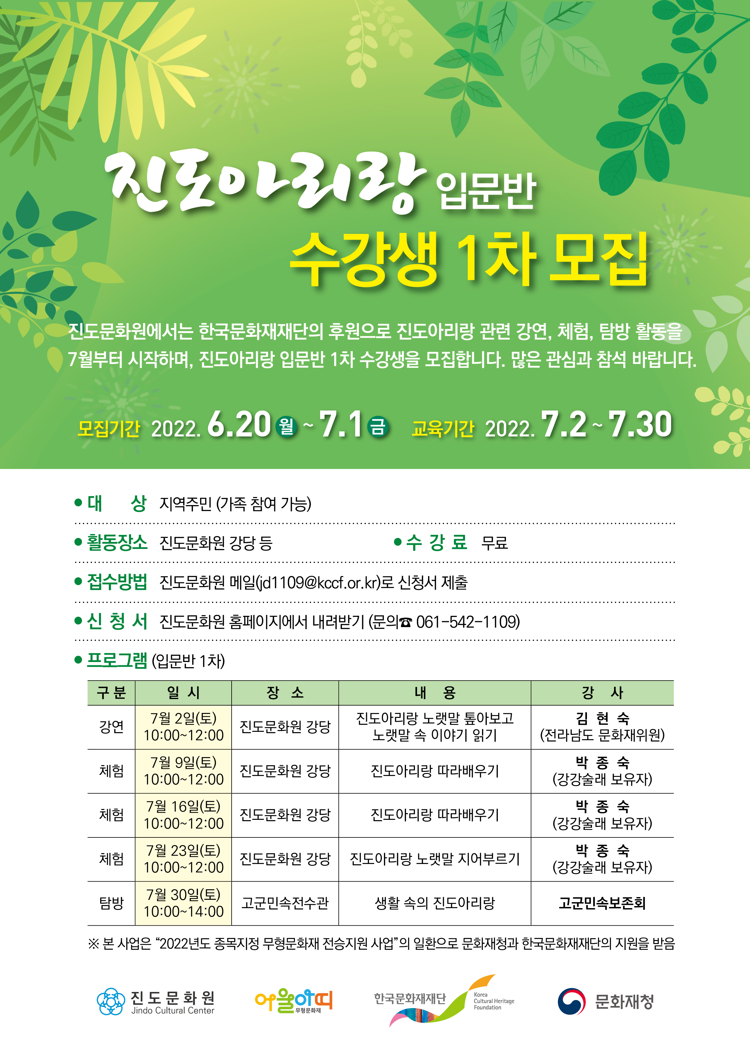 진도문화원에서 진도아리랑 입문반 수강생 추가 모집중입니다. 7월 2일(토) 김현숙 강사님을 모시고 이론을 강의하였으며 7월 9일(토) 박종숙 강사님을 모시고 본격적인 진도아리랑 따라배우기가 진행됩니다. 많은 관심과 신청 바랍니다.