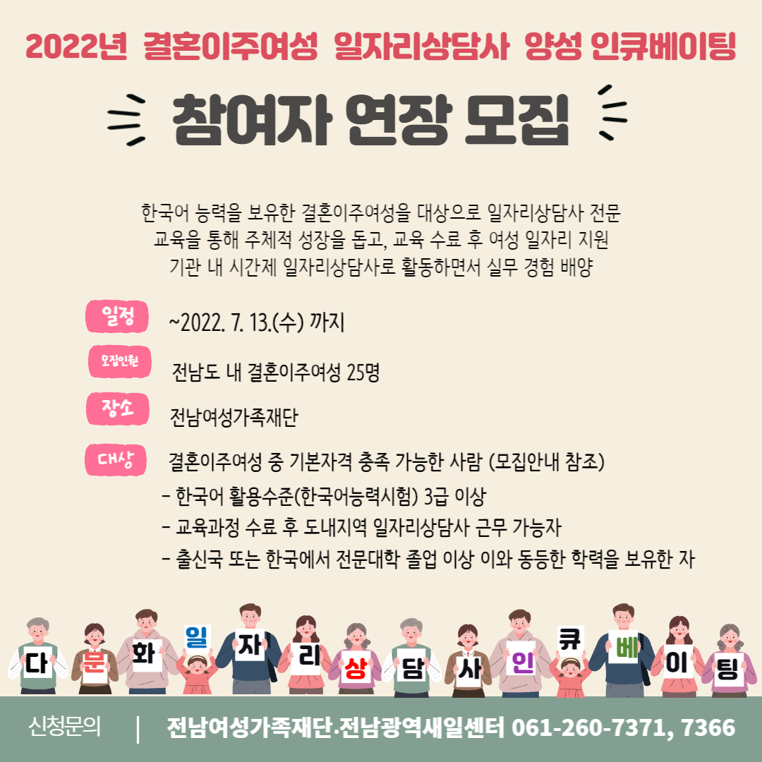 「2022년 결혼이주여성 일자리상담사 양성 인큐베이팅」교육 연장 모집 공고