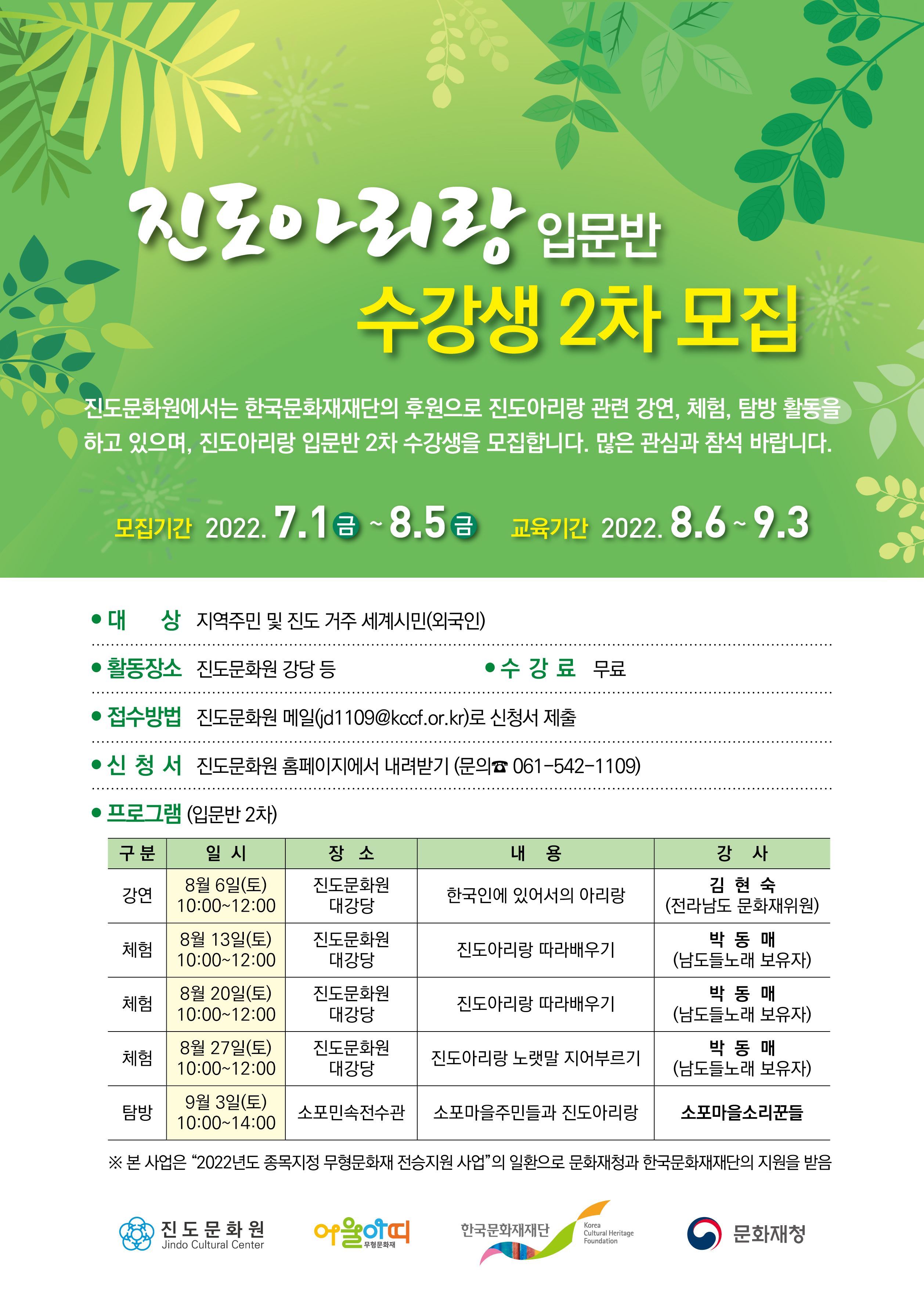 진도아리랑 입문반 2차 수강생을 모집합니다. 많은 관심과 참석 바랍니다.