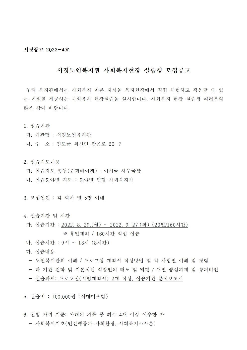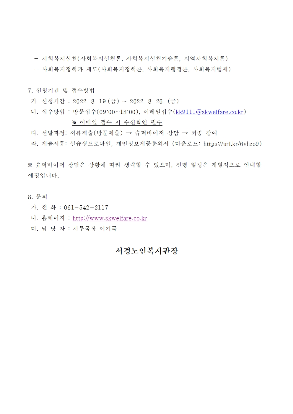 2022년 8월 서경노인복지관 사회복지현장 실습생 모집공고