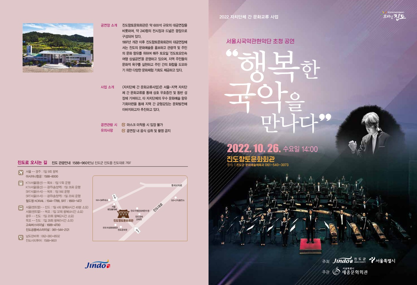 서울시국악관현악단 초청공연이 "헹복한 국악을 만나다"라는 주제로 10월 26일(수) 오후2시에 진도향토문화회관 대공연장에서 펼쳐집니다. MBN 조선판스타 준우승자 "정초롱"님 소리 협연 등 다양한 공연 프로그램이 예정되어 있으니 많은 관람바랍니다.