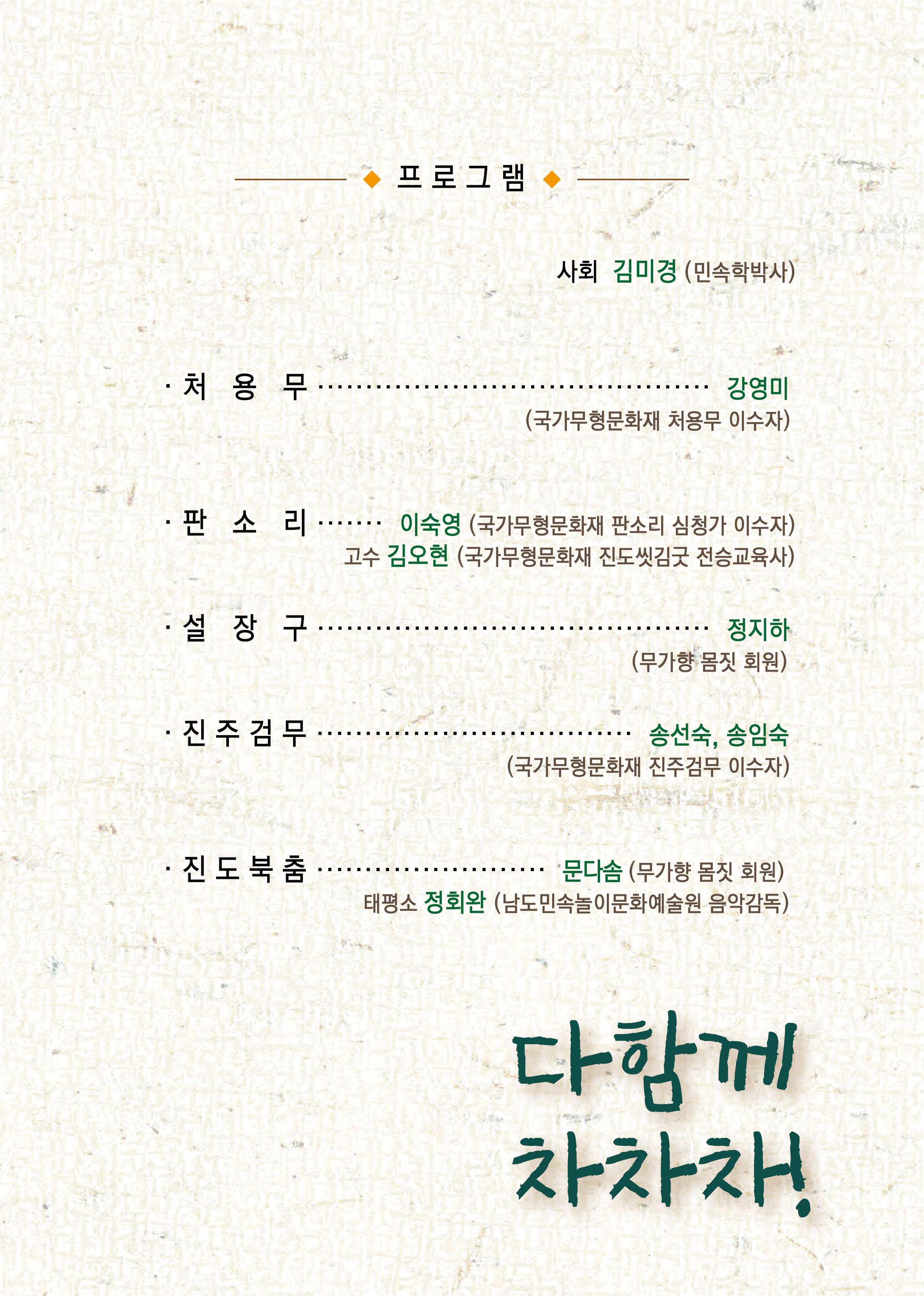 <2022 진도군 문화진흥기금 - 다함께 차차차!> 문화재 이수자 등 다양한 전통공연예술인들이 함께하는 공연에 진도군민 여러분들을 초대합니다!! 일시 : 2022년 10월 25일 (화) 오후6시30분 장소 : 진도 현대미술관