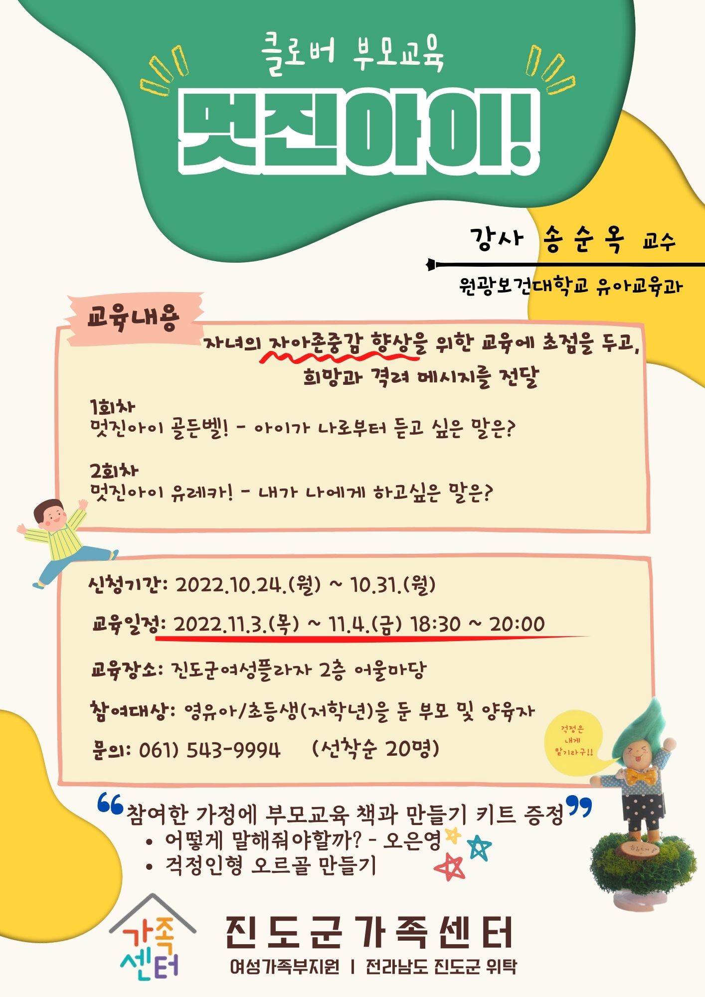 ♣가족센터♣ 내 아이 자존감 쑥쑥! 어떻게 키워줄까? '클로버 부모교육 -멋진아이' (선착순모집)