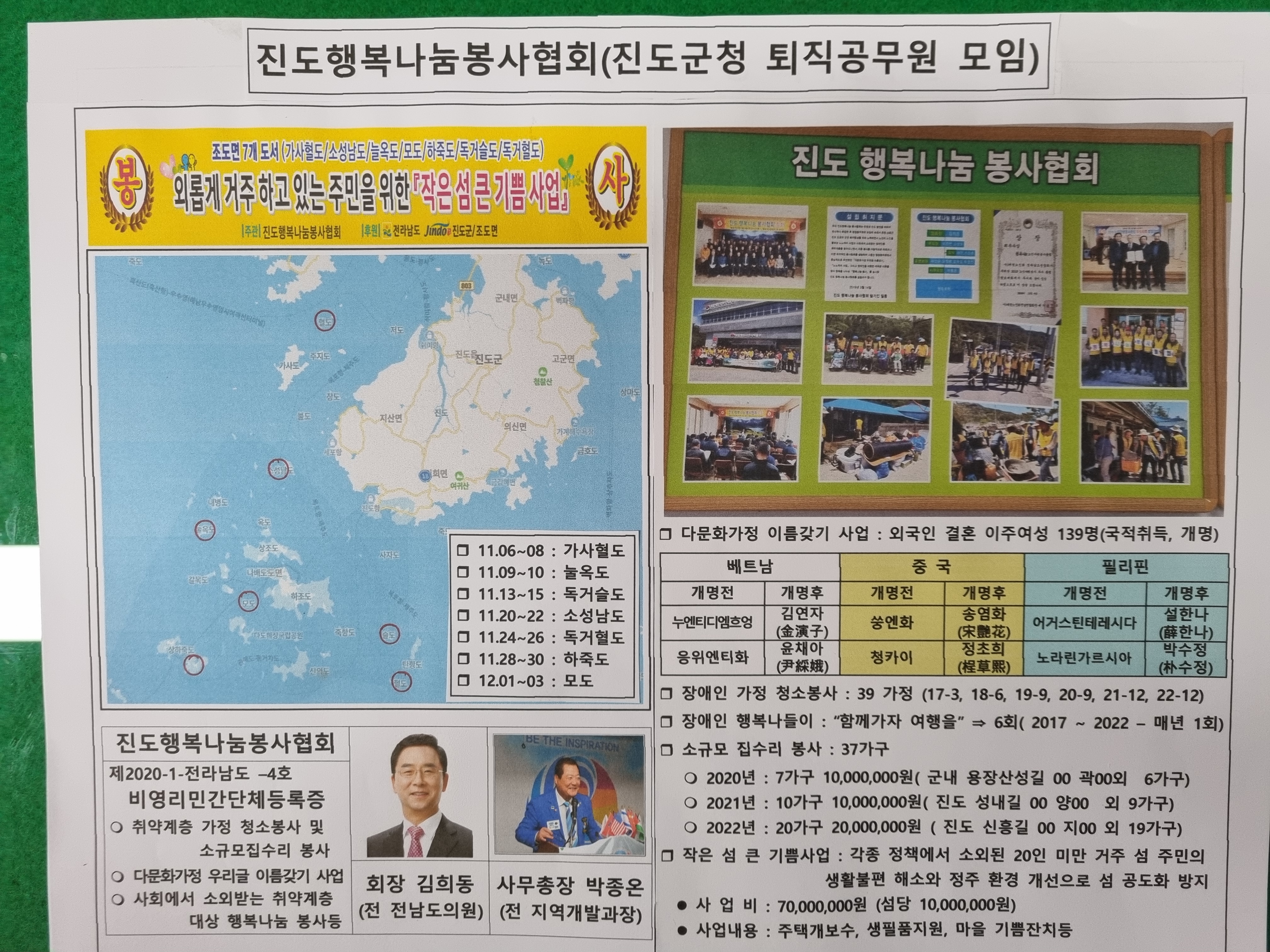 각종 정책에서 소외된 7개 섬 주민의 생활 불편 해소와 정주 환경 개선으로 섬 공도화 방지를 위하여 진도행복나눔봉사협회에서 주택개보수, 생필품지원, 마을 기쁨잔치 등을 실시합니다.;