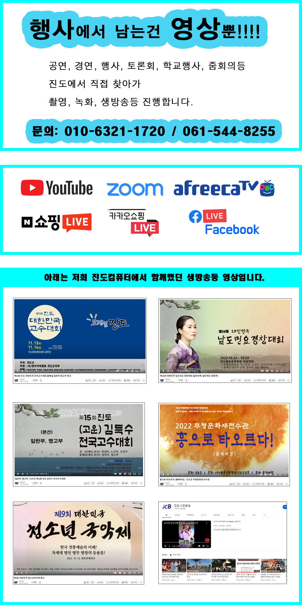진도시민방송은 유튜브 생방송 촬영, 강의, 행사, 토론회등 출장 촬영가능합니다.