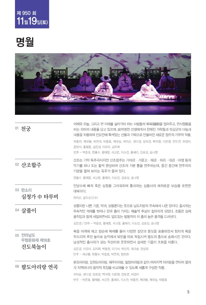 천궁, 산조합주, 심청가 중 타루비, 살풀이, 진도북놀이, 팔도아리랑 연곡 등 다양한 공연이 준비되어 있습니다.