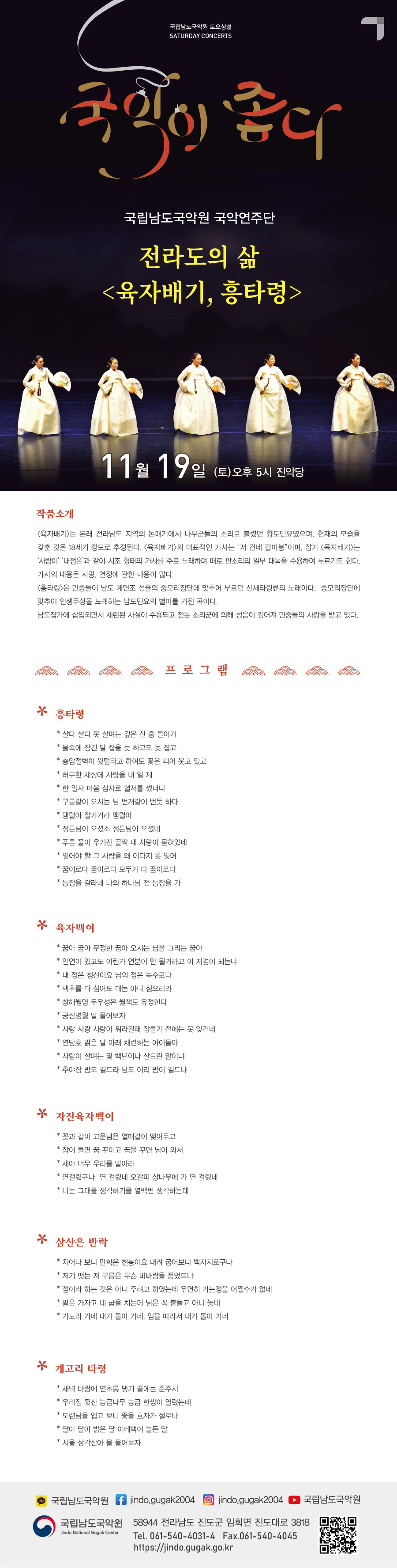 11월 셋째 주 토요상설 ‘국악이 좋다!’는 국립남도국악원 국악연주단 <전라도의 삶 “육자배기, 흥타령”>입니다.