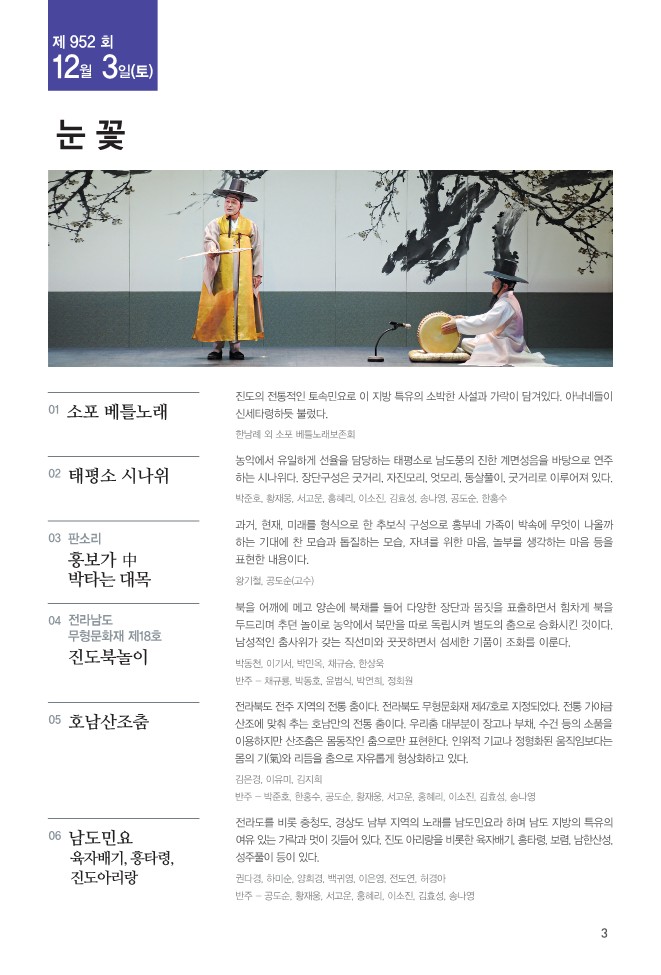 제952회 진도토요민속여행 상설공연이 "눈 꽃"을 주제로 펼쳐집니다.