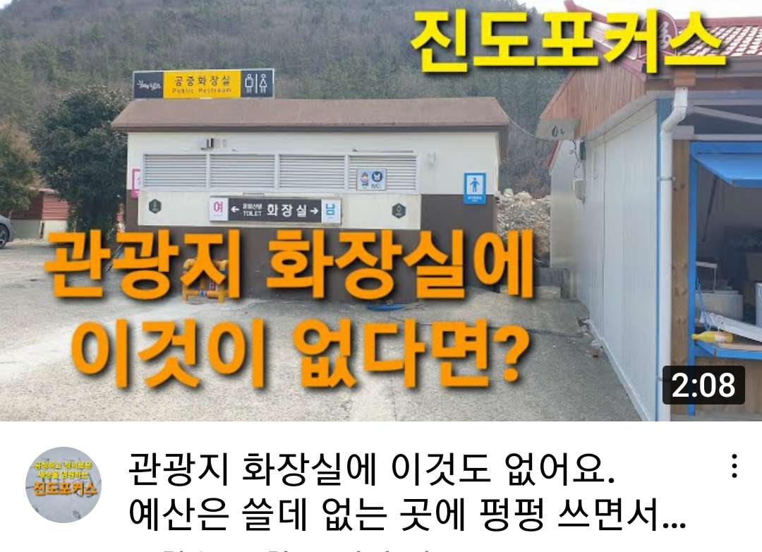https://youtu.be/Bbsn52Vb5wg 돈 많은 진도군 유명 관광지 화장실에 이게 하나 없다는게 말이 됩니까? 돈이 남아 돌아 주체를 못하더니.. 정작 쓸 곳에는 안 쓰고.. 영상으로 보시죠.. https://youtu.be/Bbsn52Vb5wg