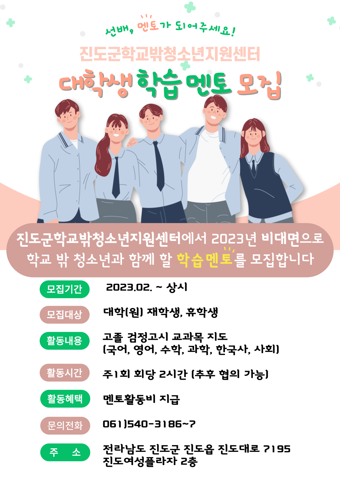 ■진도군학교밖청소년지원센터■ 검정고시 대비 비대면 대학생 학습멘토를 모집합니다!