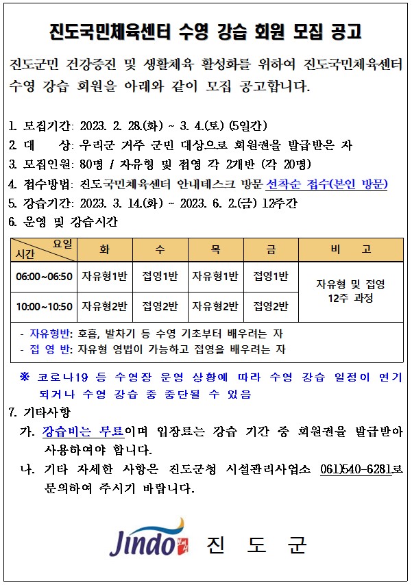 진도국민체육센터(실내수영장) 수영 무료 강습 회원 모집 일정 안내[2023년도 2회차]