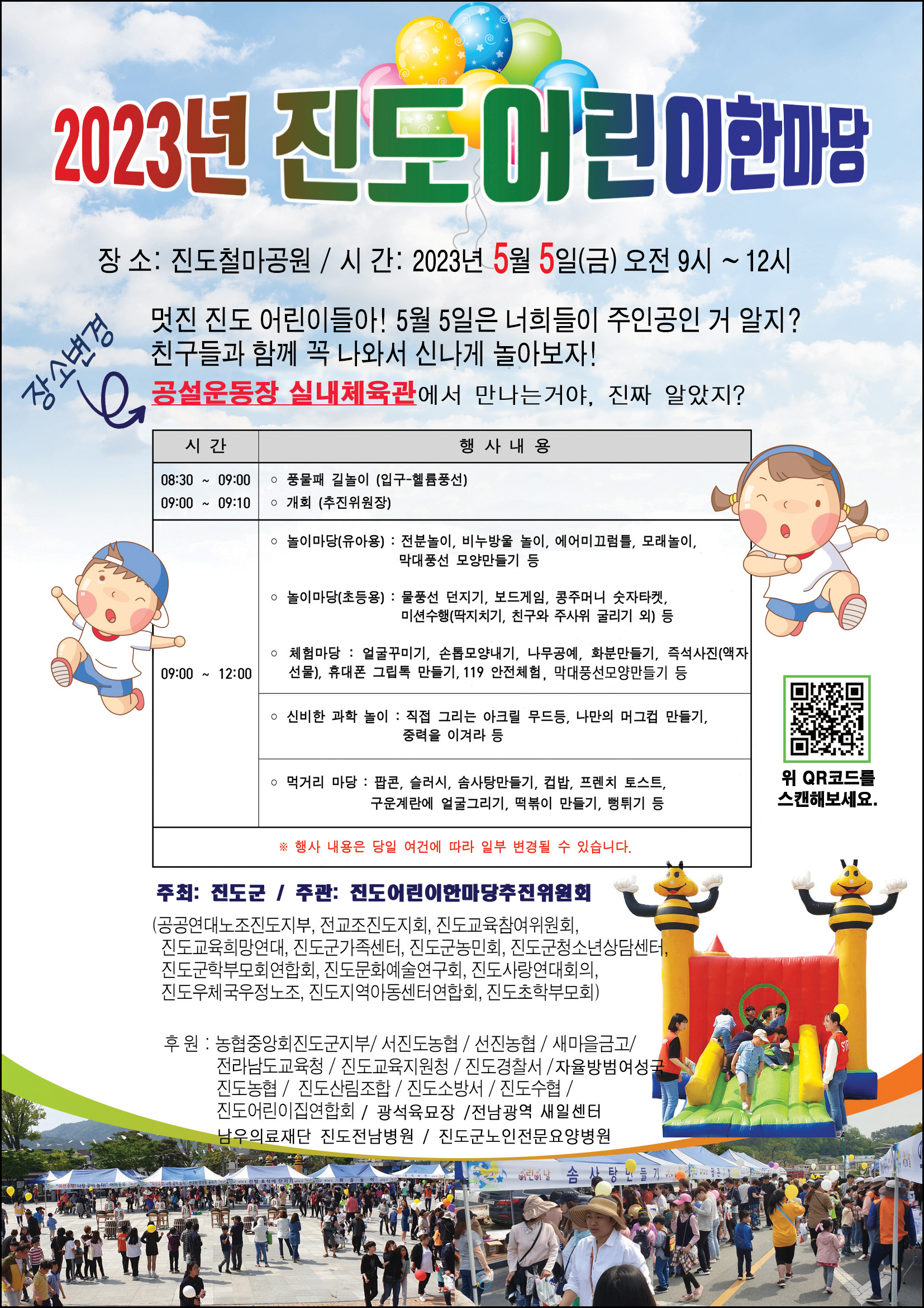 5월 5일 어린이날 행사 장소가 날씨관계로 변경되었습니다. 철마공원 -> 공설운동장 실내체육관