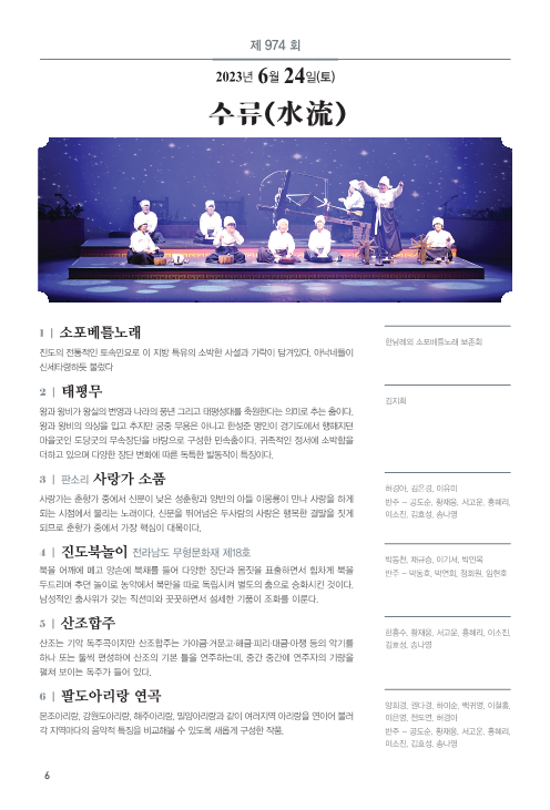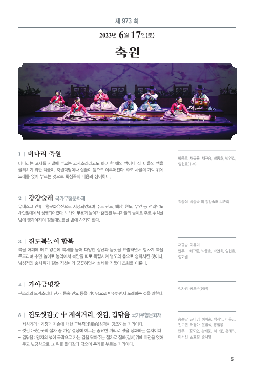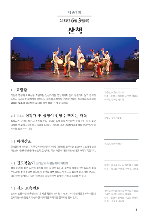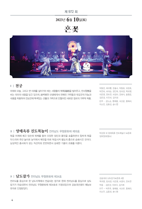□ 공연개요 ○ 공 연 명 : 진도토요민속여행 상설공연 ○ 공연일시 : 2023. 6. 매주토요일 14:00 ~ 15:30 ○ 공연장소 : 향토문화회관 대공연장
